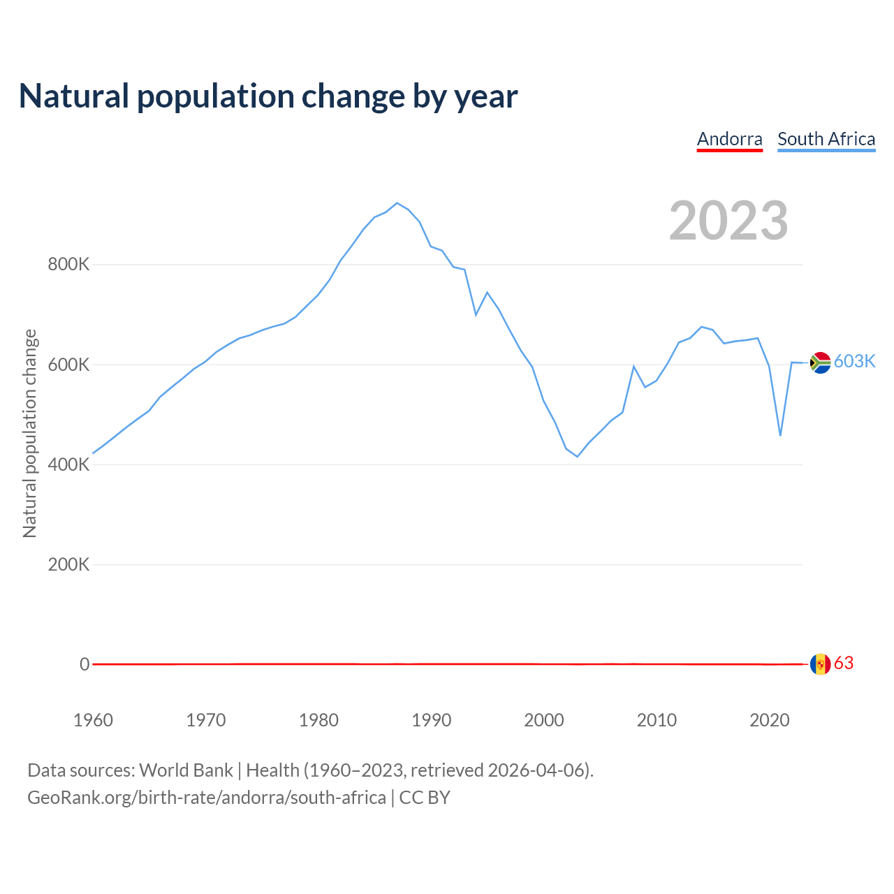 Andorra has an annual birth rate of 6.86 births per 1,000 people, compared to 18.8 for South Africa. The average number of children a woman is expected to have during her lifetime — the fertility rate, is 1.08 in Andorra and 2.22 in South Africa — 104.8% difference.