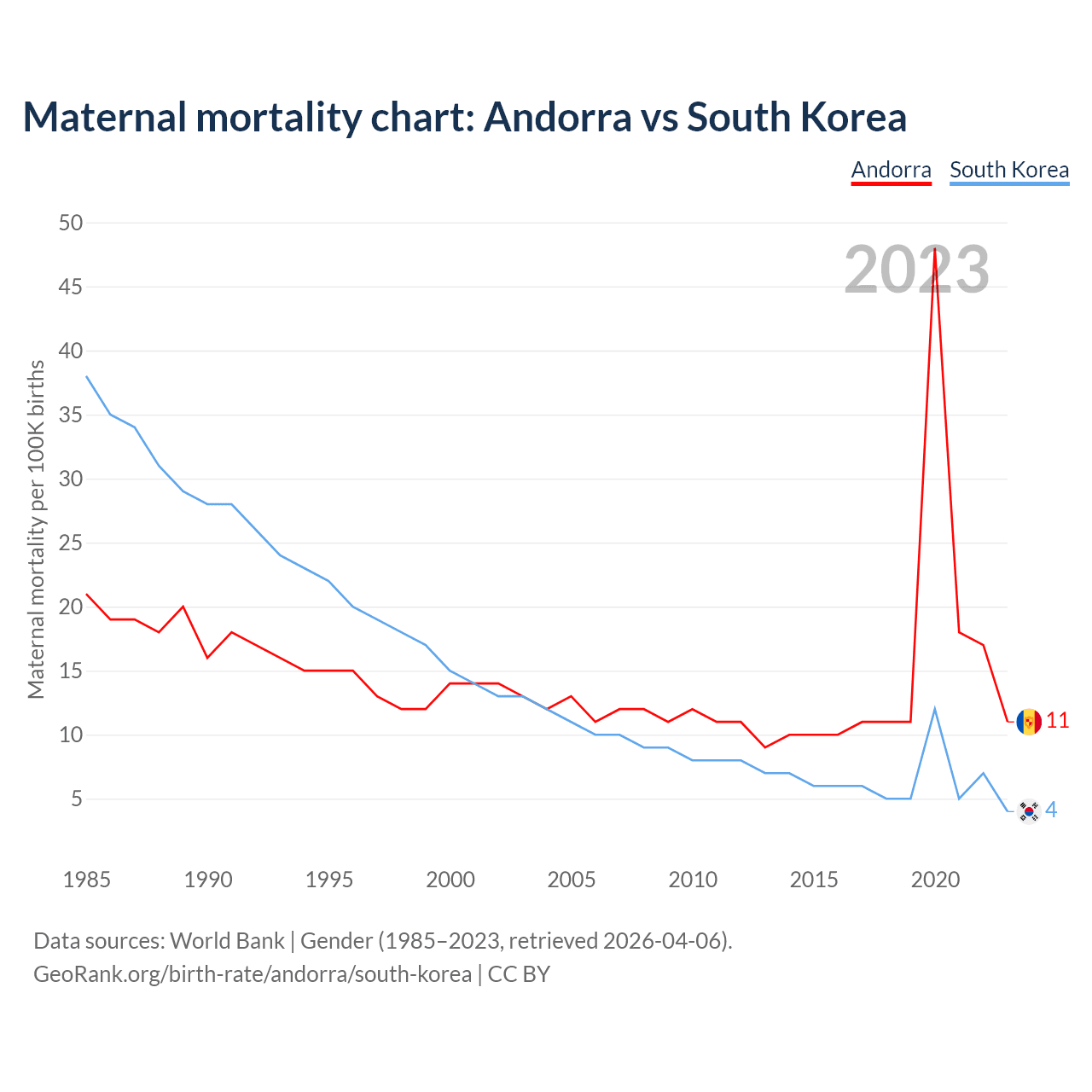 The maternal mortality rate, which is the probability of dying during childbirth or within 42 days of pregnancy termination, is 11 deaths per 100,000 live births in Andorra, compared to 4 deaths in South Korea.