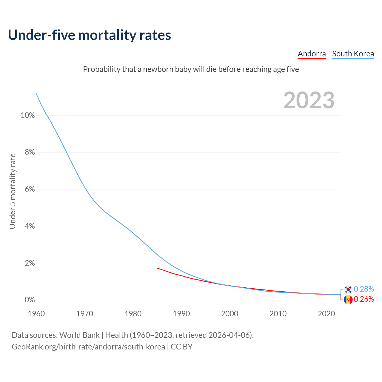The chance that a newborn baby will die before reaching age five is 0.26% in Andorra and 0.28% in South Korea. Above is a chart with historical data on under-five mortality rates.