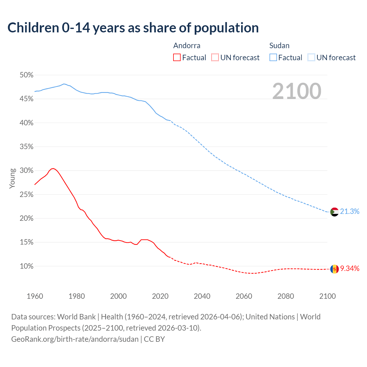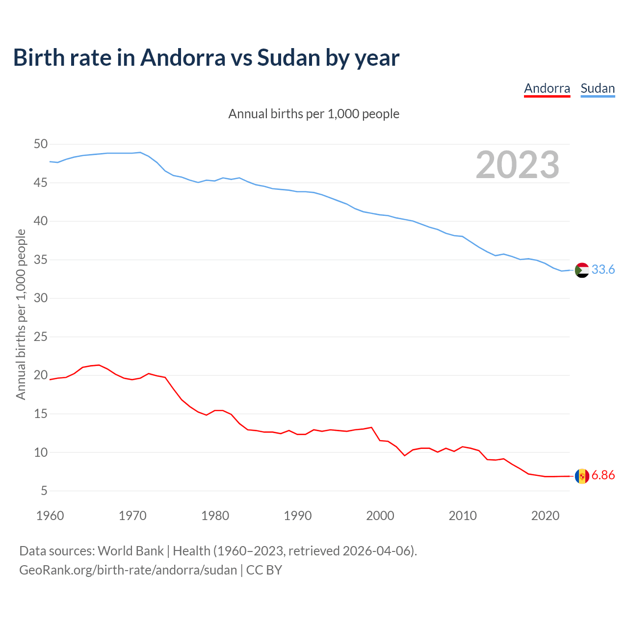 Andorra has an annual birth rate of 6.86 births per 1,000 people, compared to 33.6 for Sudan. The average number of children a woman is expected to have during her lifetime — the fertility rate, is 1.08 in Andorra and 4.32 in Sudan — 299.5% difference.