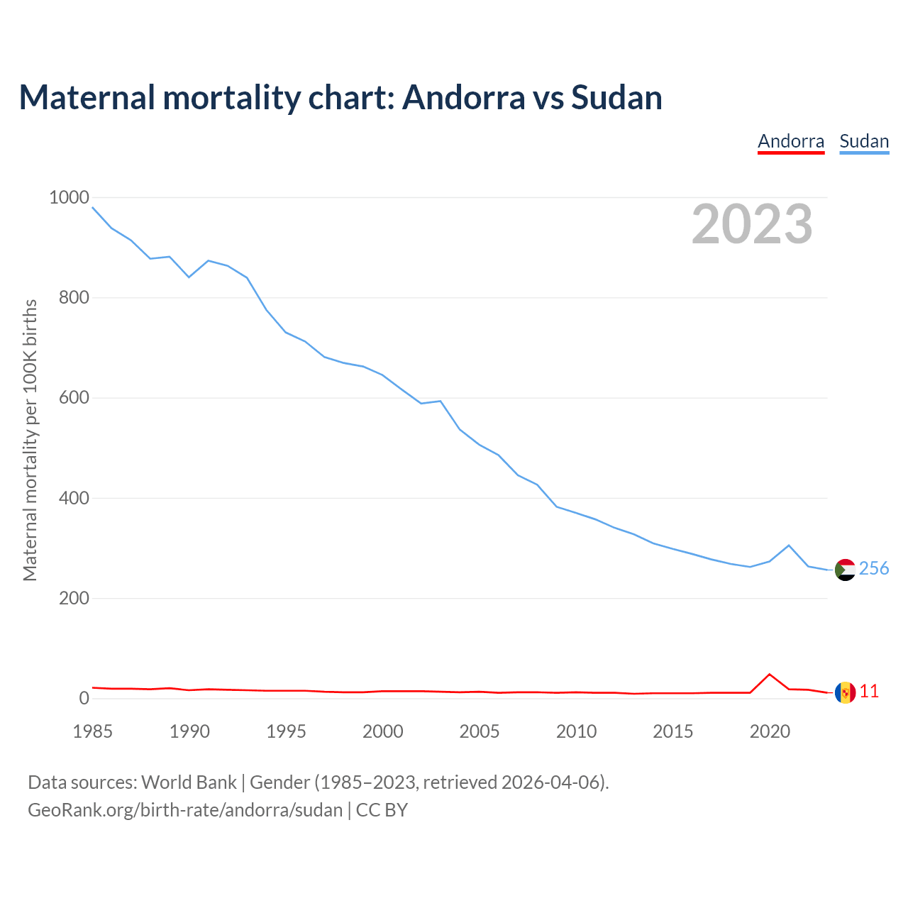 The maternal mortality rate, which is the probability of dying during childbirth or within 42 days of pregnancy termination, is 11 deaths per 100,000 live births in Andorra, compared to 256 deaths in Sudan.