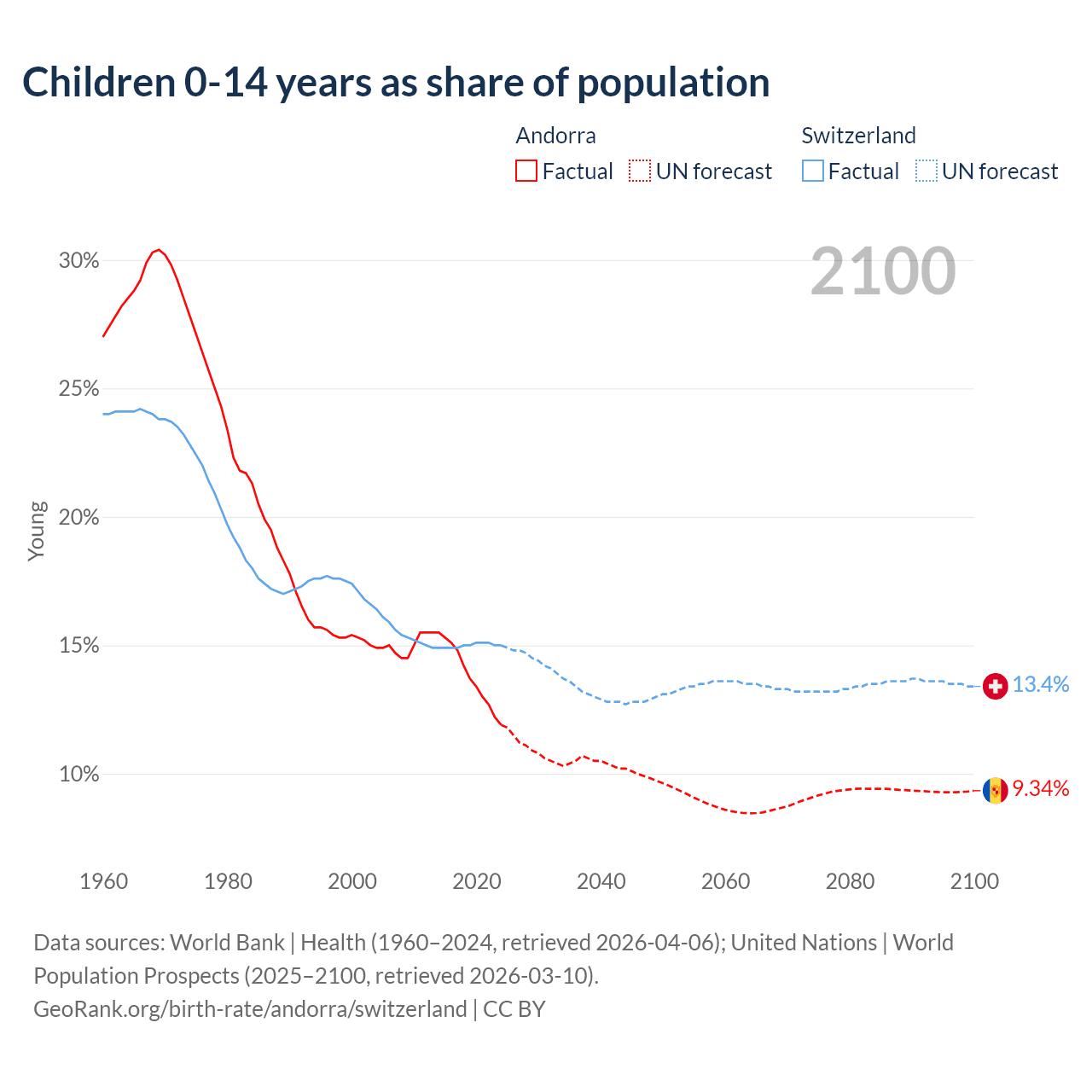 Andorra has an annual birth rate of 6.86 births per 1,000 people, compared to 9 for Switzerland. The average number of children a woman is expected to have during her lifetime — the fertility rate, is 1.08 in Andorra and 1.33 in Switzerland — 22.9% difference.