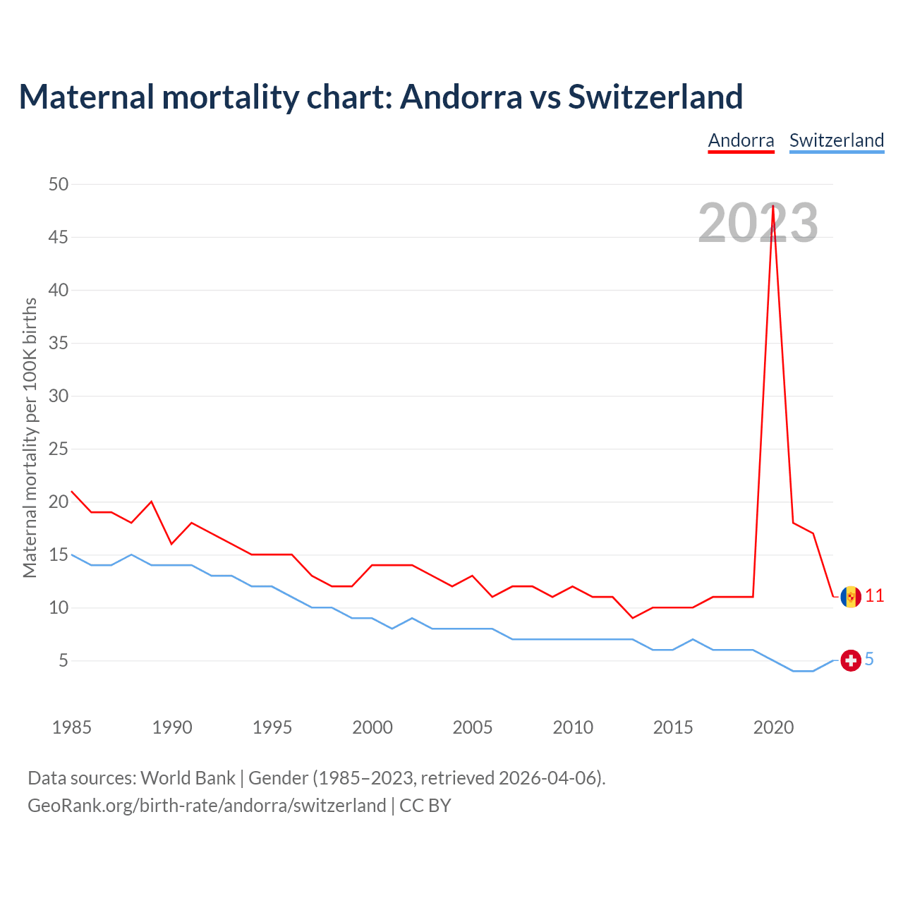 The maternal mortality rate, which is the probability of dying during childbirth or within 42 days of pregnancy termination, is 11 deaths per 100,000 live births in Andorra, compared to 5 deaths in Switzerland.