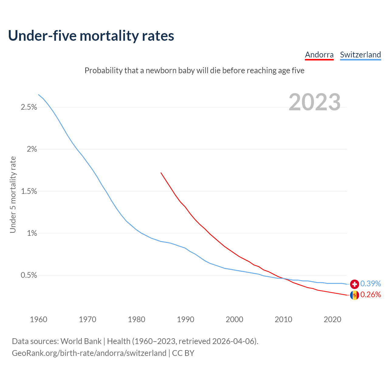 The chance that a newborn baby will die before reaching age five is 0.26% in Andorra and 0.39% in Switzerland. Above is a chart with historical data on under-five mortality rates.