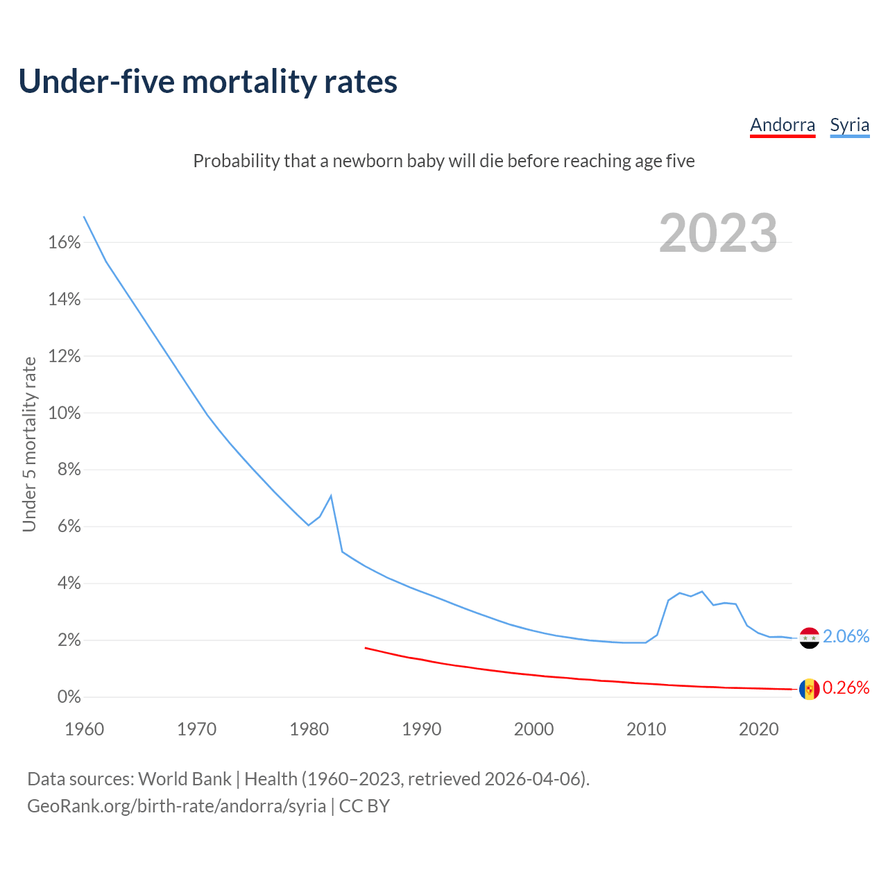 The chance that a newborn baby will die before reaching age five is 0.26% in Andorra and 2.06% in Syria. Above is a chart with historical data on under-five mortality rates.