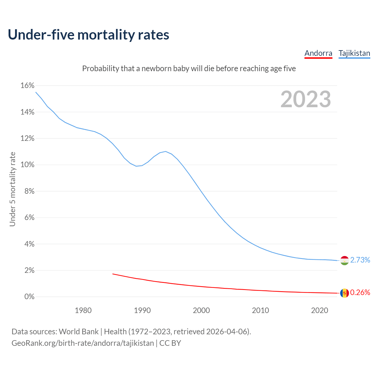 The chance that a newborn baby will die before reaching age five is 0.26% in Andorra and 2.73% in Tajikistan. Above is a chart with historical data on under-five mortality rates.