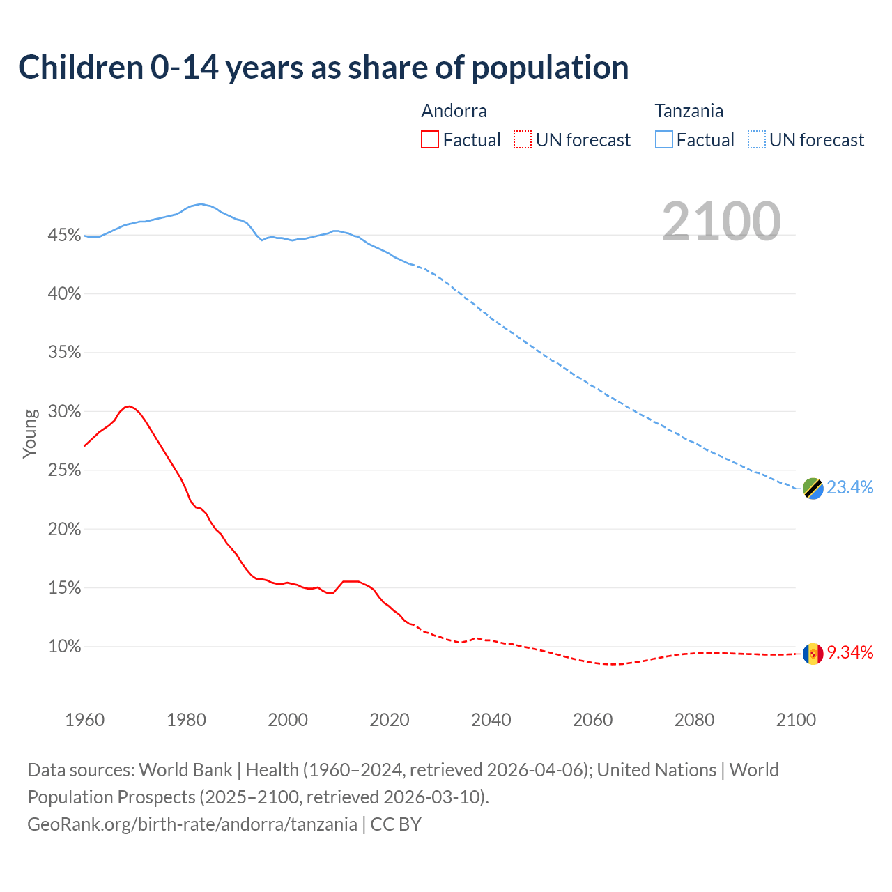 Andorra has an annual birth rate of 6.86 births per 1,000 people, compared to 35.2 for Tanzania. The average number of children a woman is expected to have during her lifetime — the fertility rate, is 1.08 in Andorra and 4.61 in Tanzania — 326% difference.