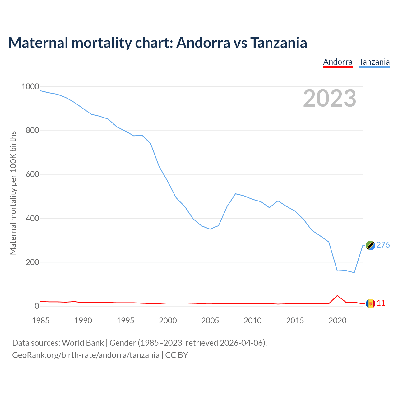 The maternal mortality rate, which is the probability of dying during childbirth or within 42 days of pregnancy termination, is 11 deaths per 100,000 live births in Andorra, compared to 276 deaths in Tanzania.