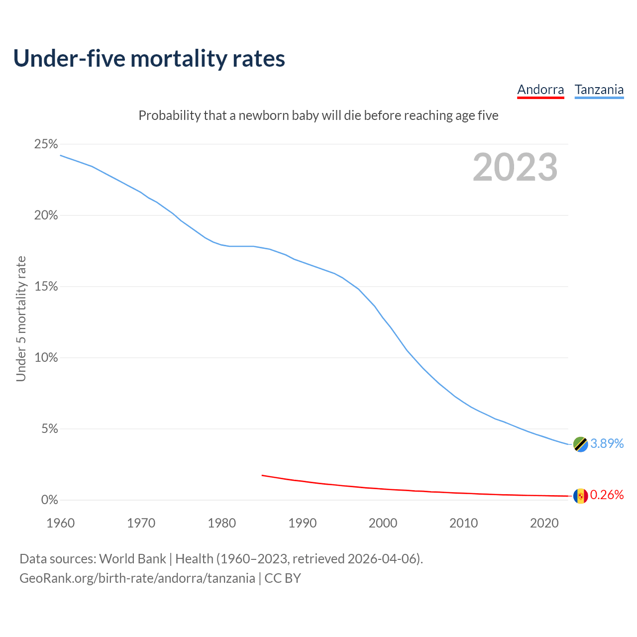 The chance that a newborn baby will die before reaching age five is 0.26% in Andorra and 3.89% in Tanzania. Above is a chart with historical data on under-five mortality rates.