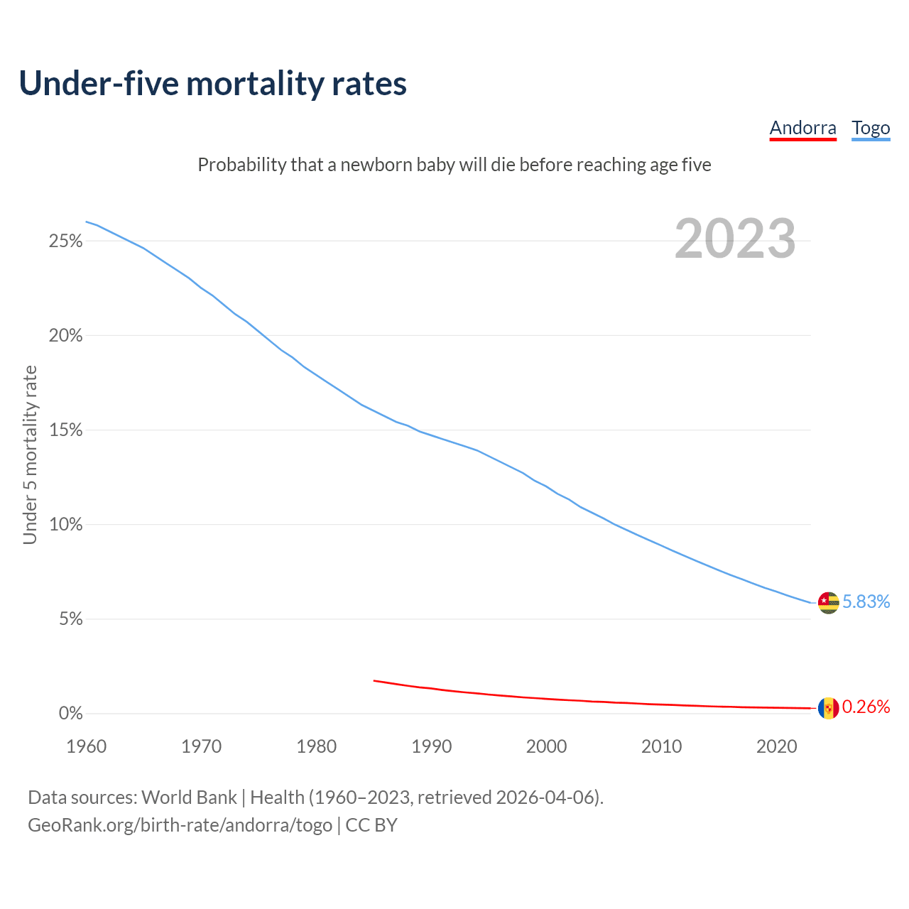 The chance that a newborn baby will die before reaching age five is 0.26% in Andorra and 5.83% in Togo. Above is a chart with historical data on under-five mortality rates.
