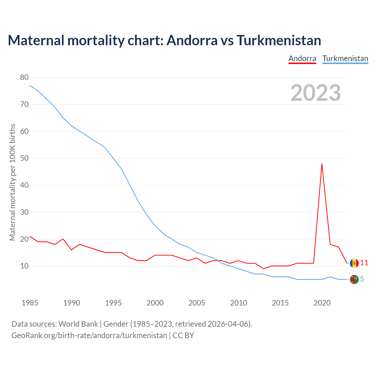 The maternal mortality rate, which is the probability of dying during childbirth or within 42 days of pregnancy termination, is 11 deaths per 100,000 live births in Andorra, compared to 5 deaths in Turkmenistan.