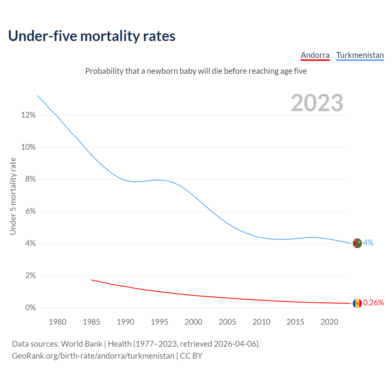 The chance that a newborn baby will die before reaching age five is 0.26% in Andorra and 4% in Turkmenistan. Above is a chart with historical data on under-five mortality rates.