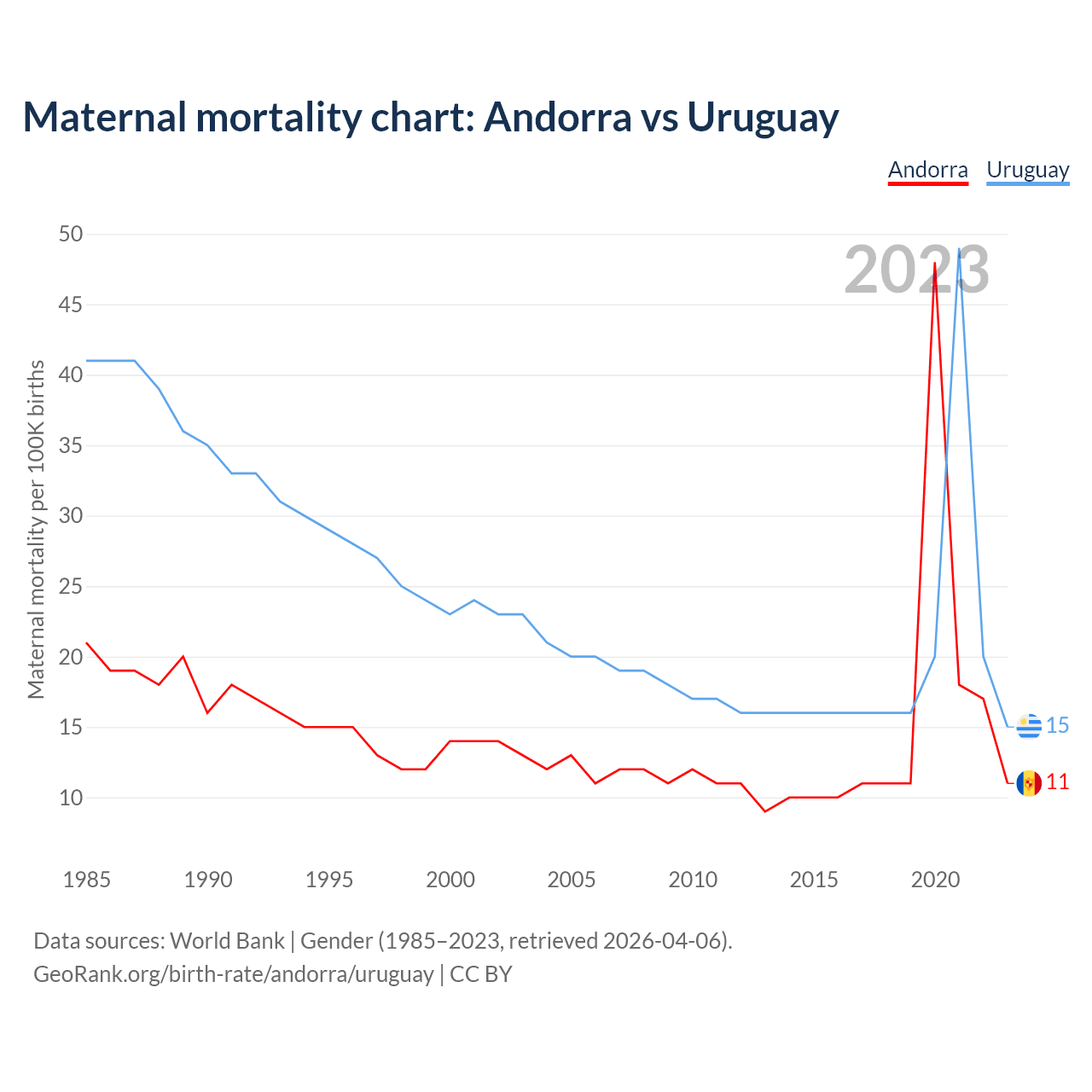 The maternal mortality rate, which is the probability of dying during childbirth or within 42 days of pregnancy termination, is 11 deaths per 100,000 live births in Andorra, compared to 15 deaths in Uruguay.