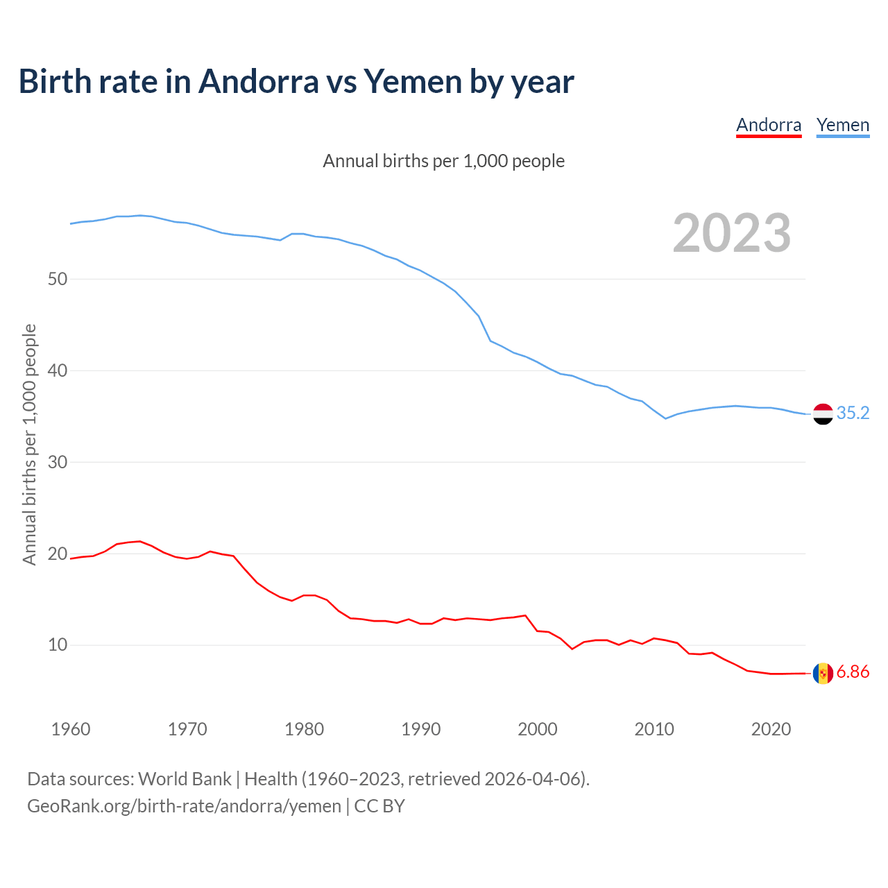 Andorra has an annual birth rate of 6.86 births per 1,000 people, compared to 35.2 for Yemen. The average number of children a woman is expected to have during her lifetime — the fertility rate, is 1.08 in Andorra and 4.59 in Yemen — 324% difference.