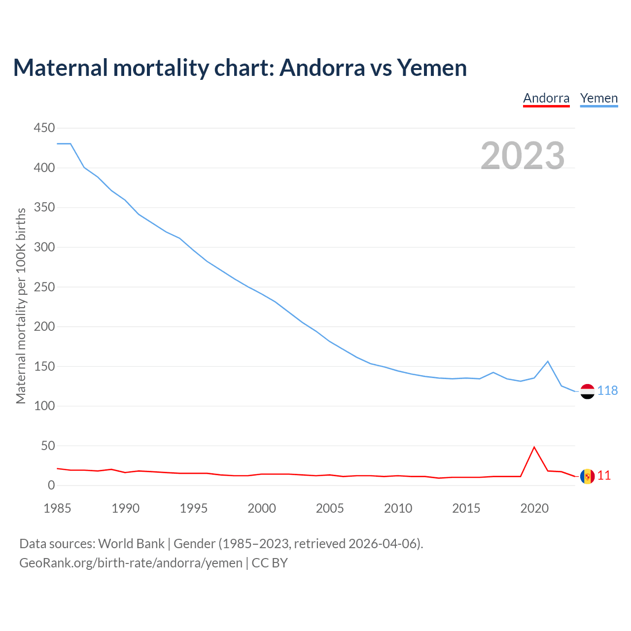 The maternal mortality rate, which is the probability of dying during childbirth or within 42 days of pregnancy termination, is 11 deaths per 100,000 live births in Andorra, compared to 118 deaths in Yemen.