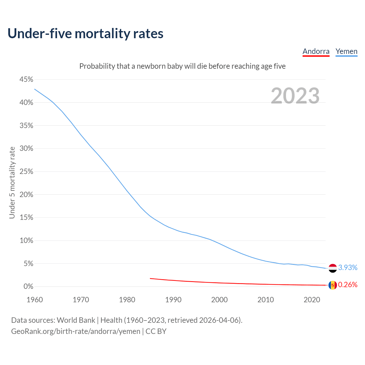 The chance that a newborn baby will die before reaching age five is 0.26% in Andorra and 3.93% in Yemen. Above is a chart with historical data on under-five mortality rates.