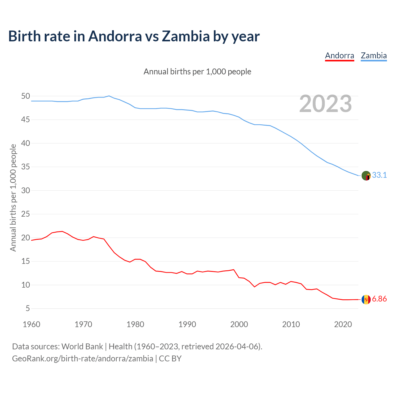 Andorra has an annual birth rate of 6.86 births per 1,000 people, compared to 33.1 for Zambia. The average number of children a woman is expected to have during her lifetime — the fertility rate, is 1.08 in Andorra and 4.1 in Zambia — 279% difference.