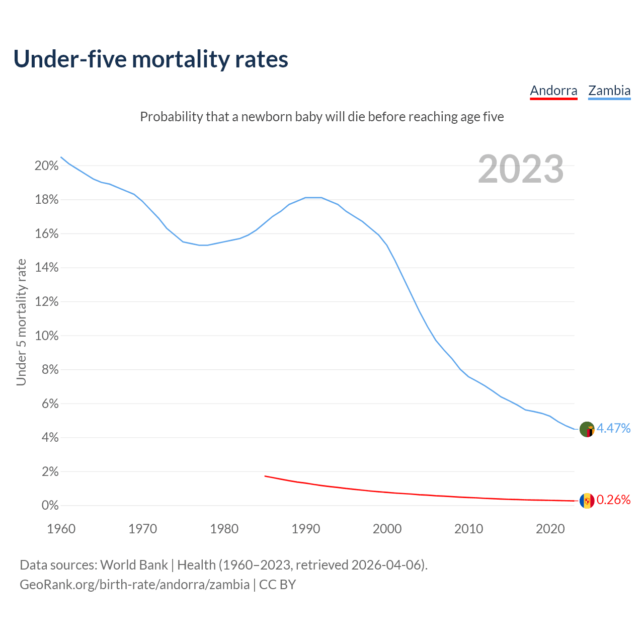 The chance that a newborn baby will die before reaching age five is 0.26% in Andorra and 4.47% in Zambia. Above is a chart with historical data on under-five mortality rates.
