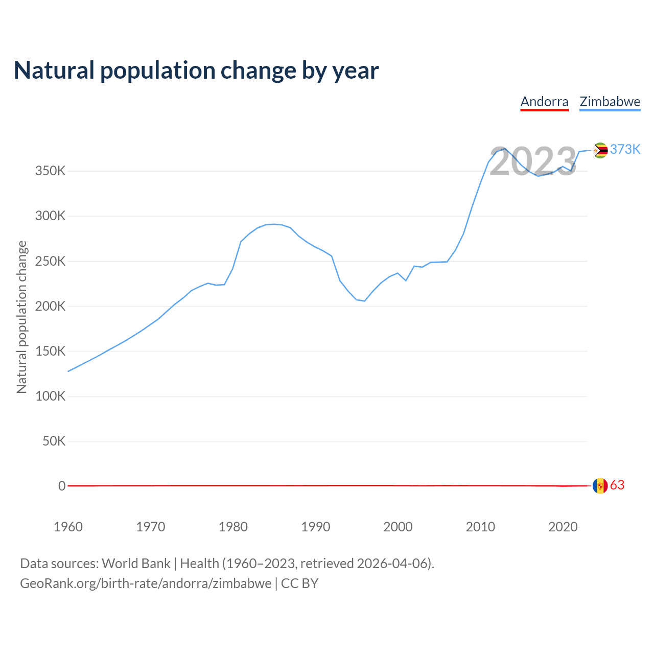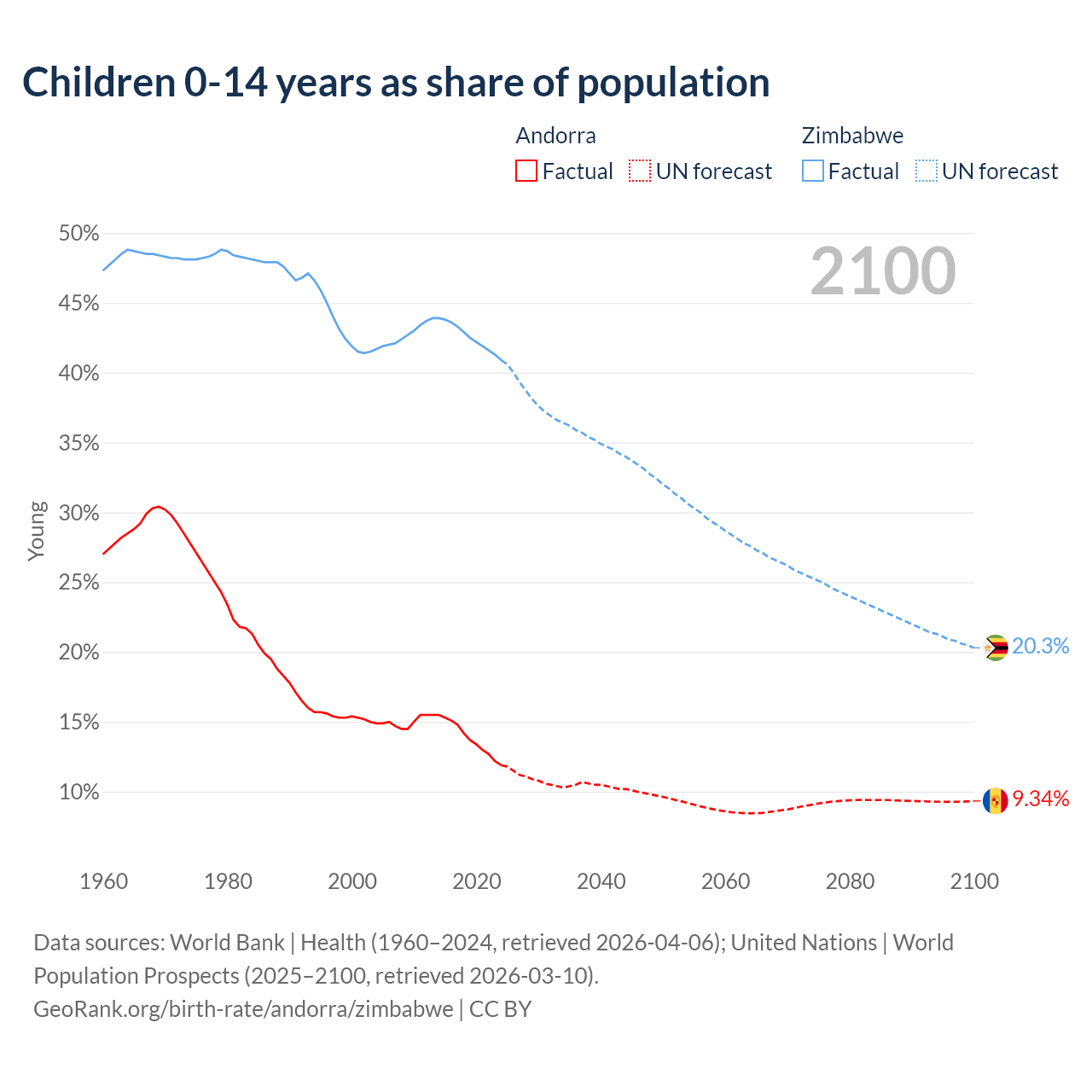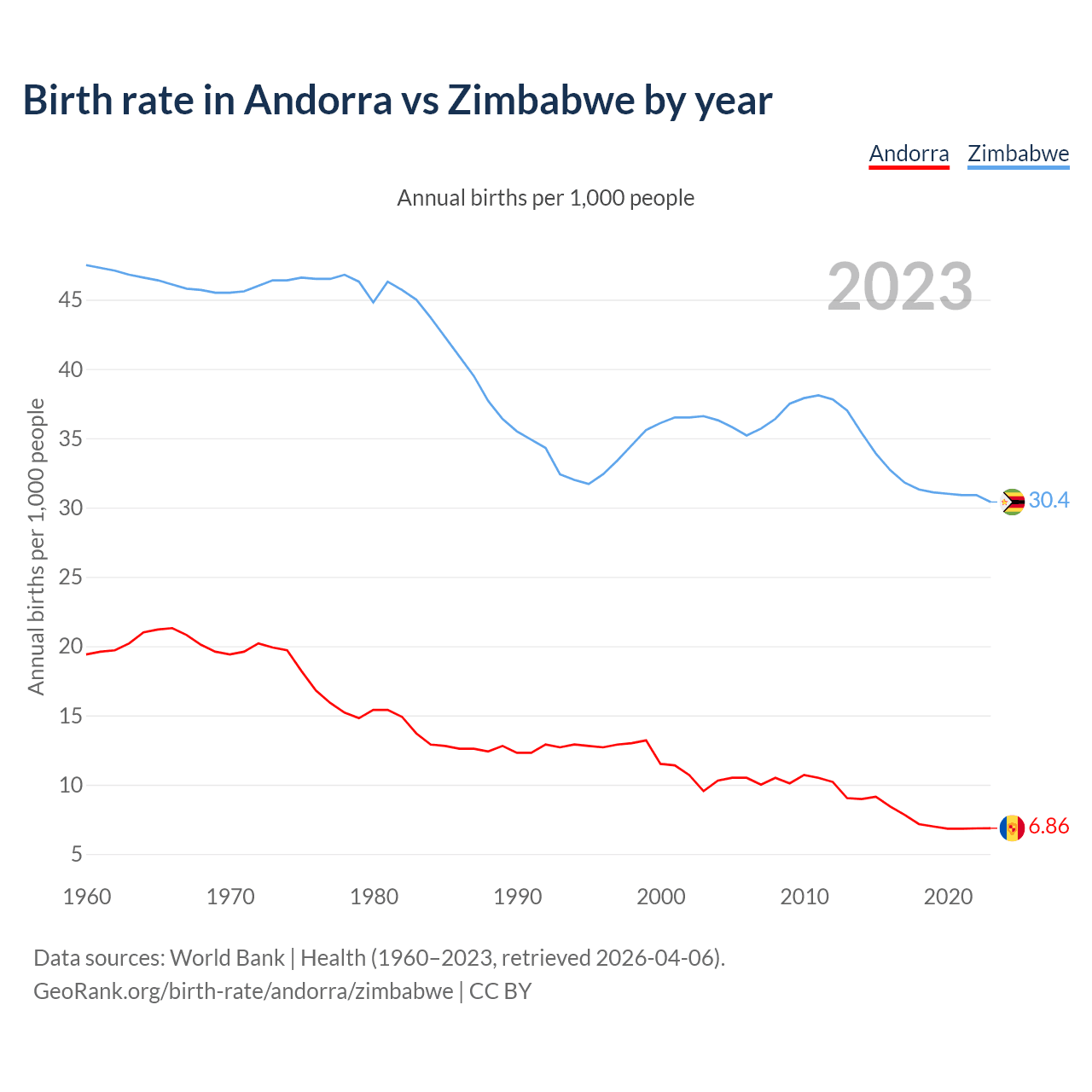 Andorra has an annual birth rate of 6.86 births per 1,000 people, compared to 30.4 for Zimbabwe. The average number of children a woman is expected to have during her lifetime — the fertility rate, is 1.08 in Andorra and 3.72 in Zimbabwe — 244.2% difference.