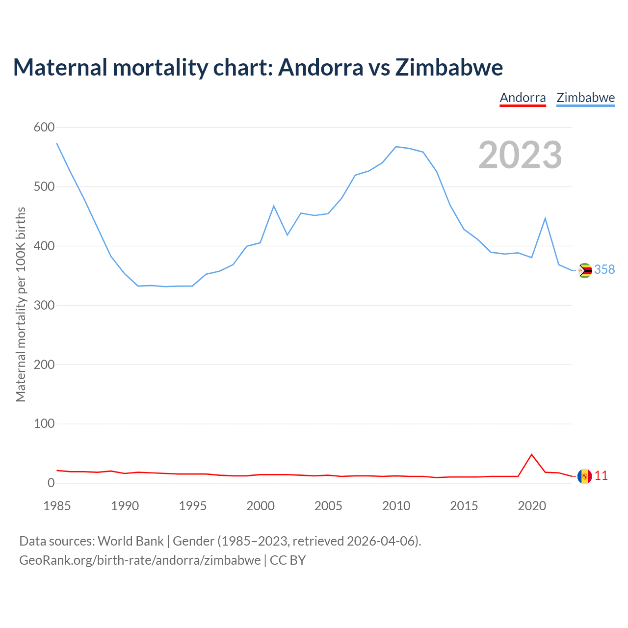 The maternal mortality rate, which is the probability of dying during childbirth or within 42 days of pregnancy termination, is 11 deaths per 100,000 live births in Andorra, compared to 358 deaths in Zimbabwe.