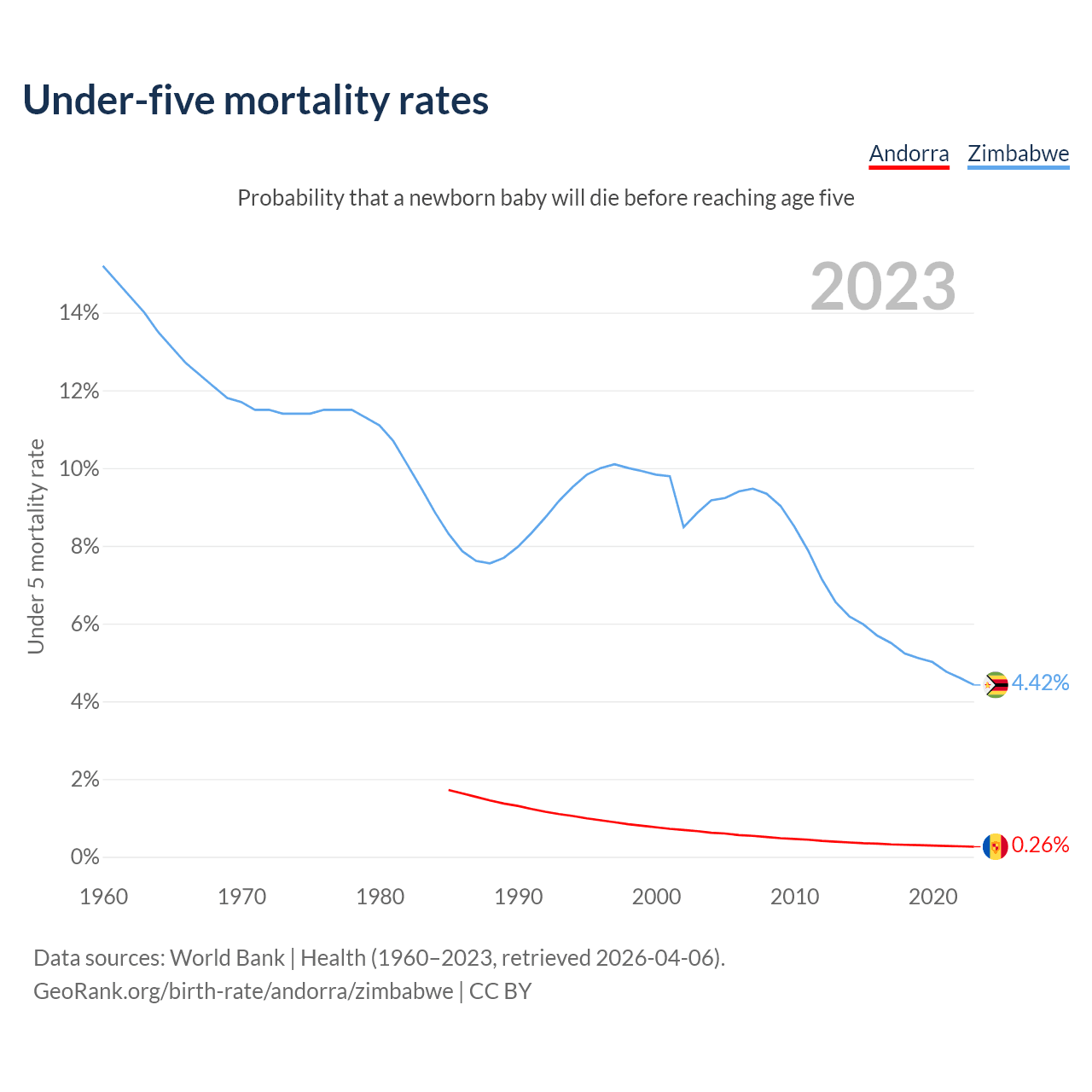 The chance that a newborn baby will die before reaching age five is 0.26% in Andorra and 4.42% in Zimbabwe. Above is a chart with historical data on under-five mortality rates.
