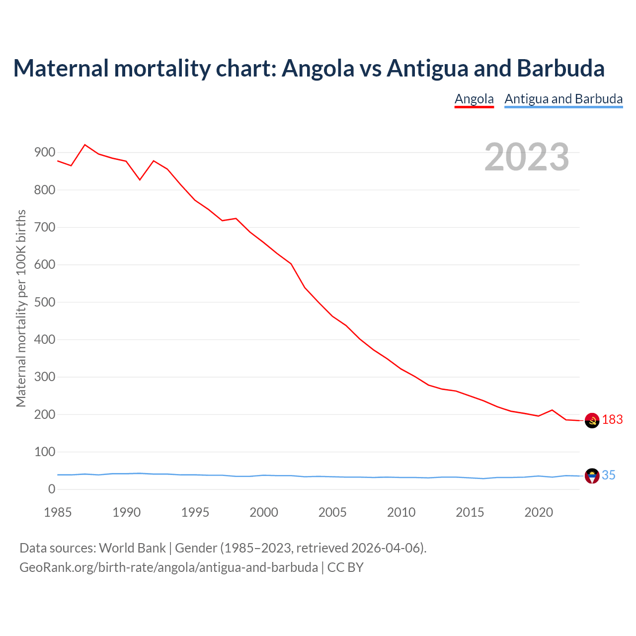 The maternal mortality rate, which is the probability of dying during childbirth or within 42 days of pregnancy termination, is 183 deaths per 100,000 live births in Angola, compared to 35 deaths in Antigua and Barbuda.