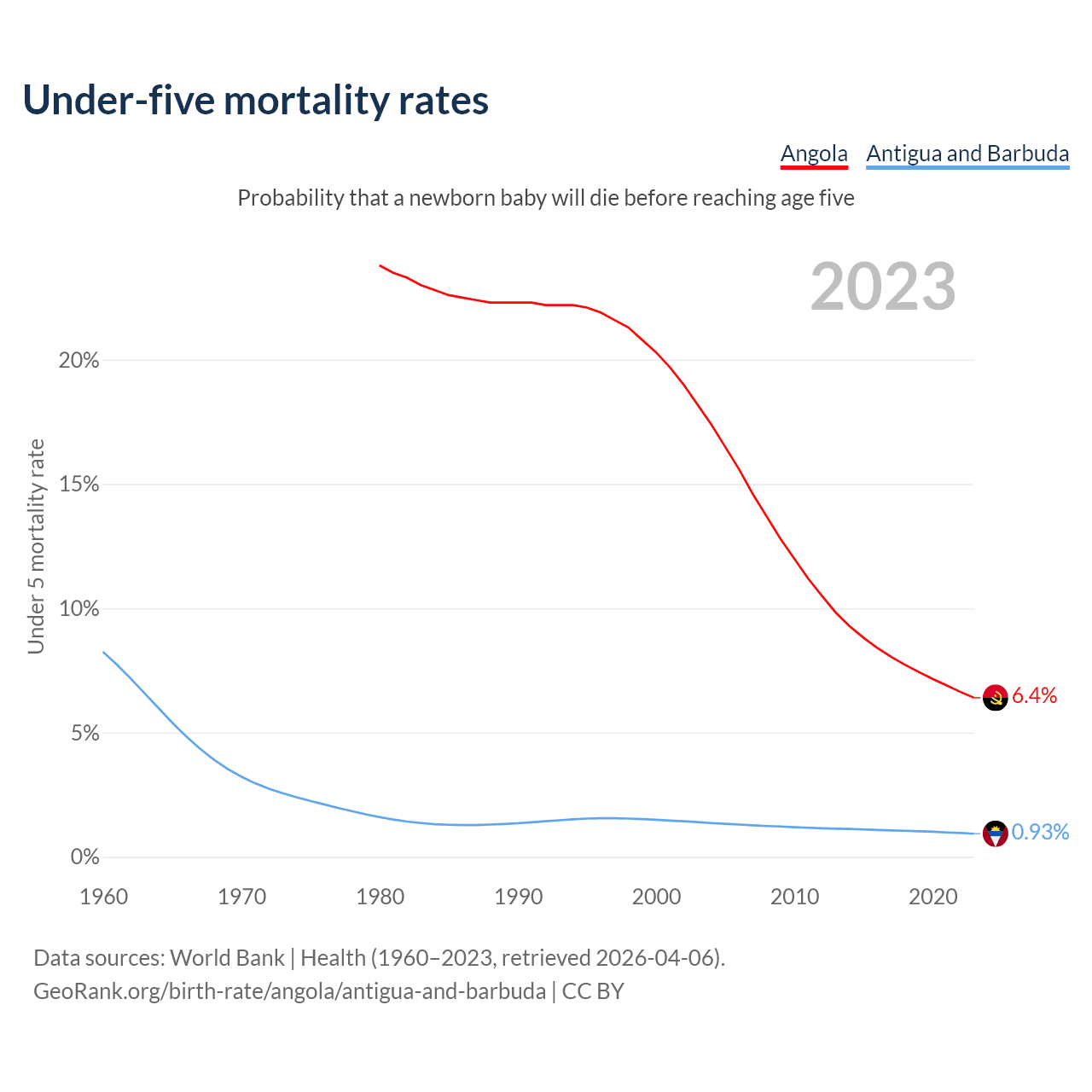 The chance that a newborn baby will die before reaching age five is 6.4% in Angola and 0.93% in Antigua and Barbuda. Above is a chart with historical data on under-five mortality rates.