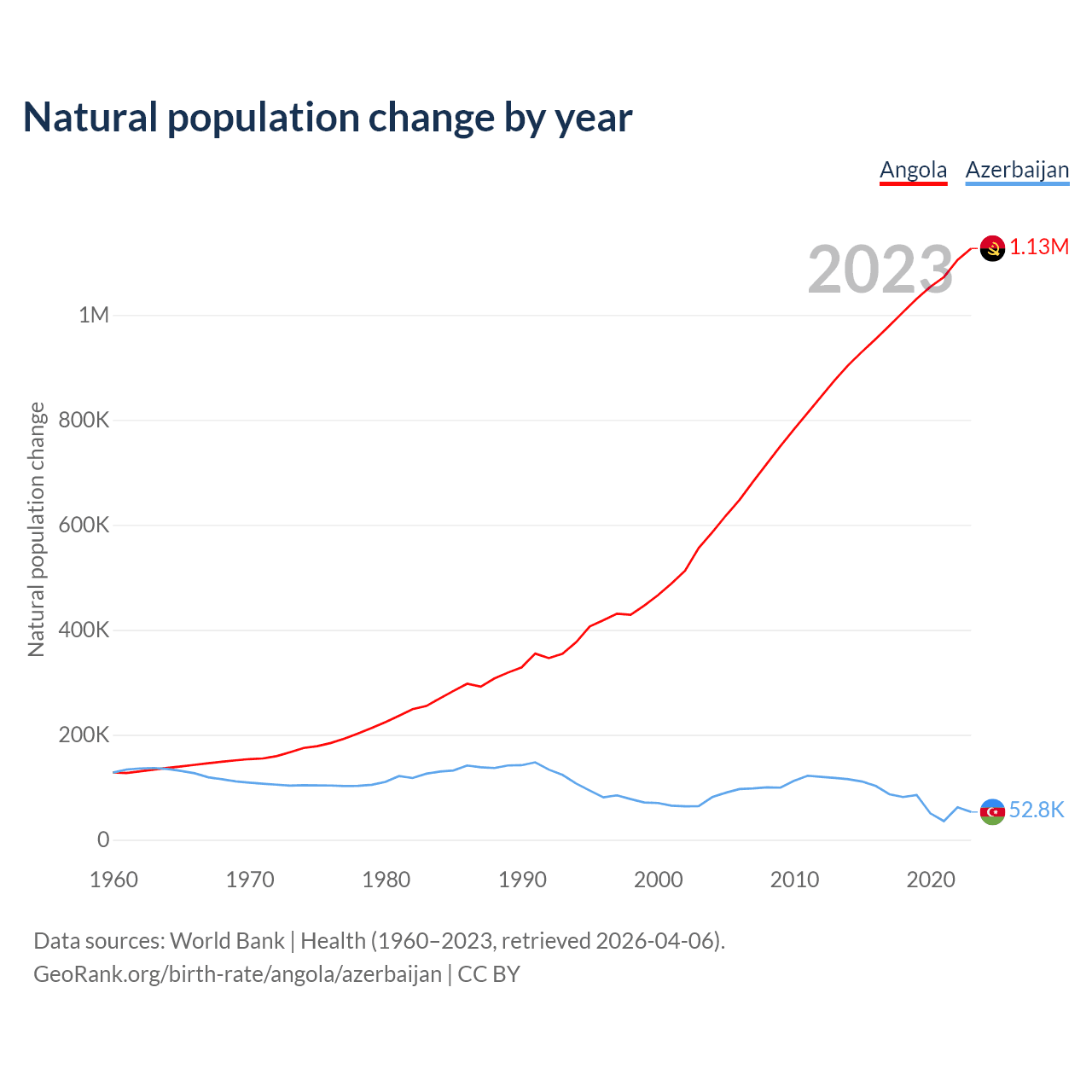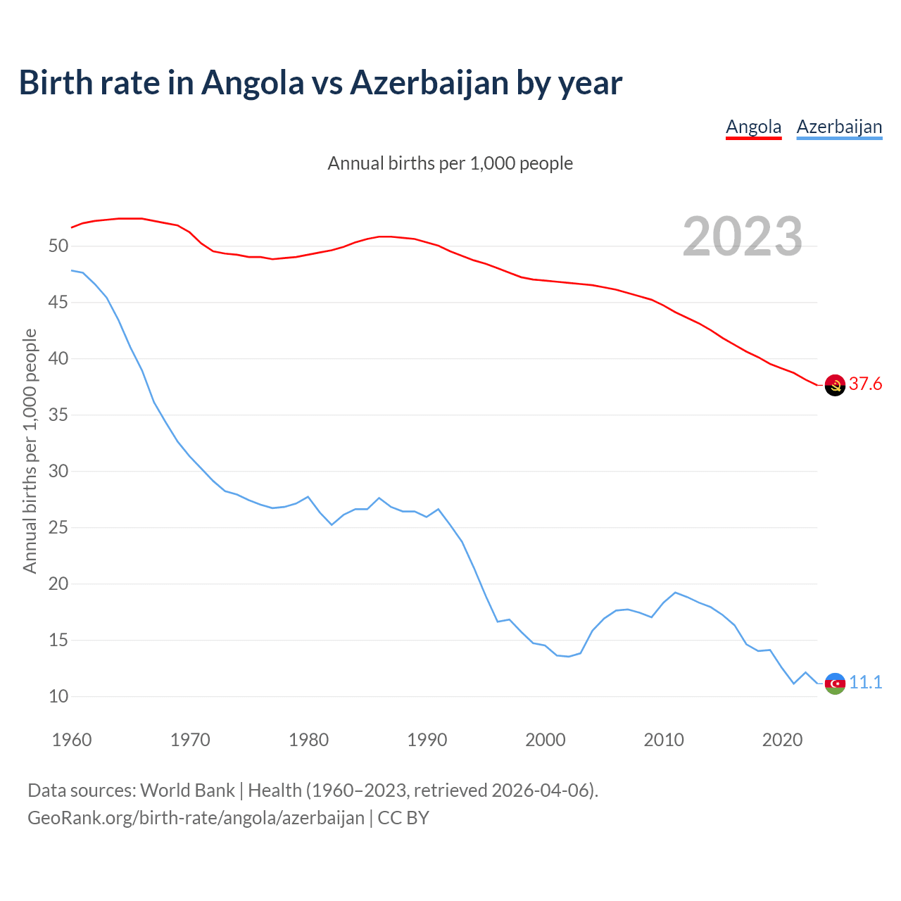 Angola has an annual birth rate of 37.6 births per 1,000 people, compared to 11.1 for Azerbaijan. The average number of children a woman is expected to have during her lifetime — the fertility rate, is 5.12 in Angola and 1.55 in Azerbaijan — 69.8% difference.
