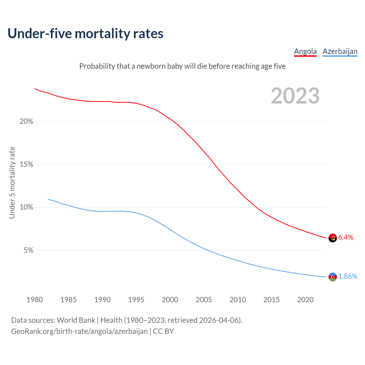 The chance that a newborn baby will die before reaching age five is 6.4% in Angola and 1.86% in Azerbaijan. Above is a chart with historical data on under-five mortality rates.