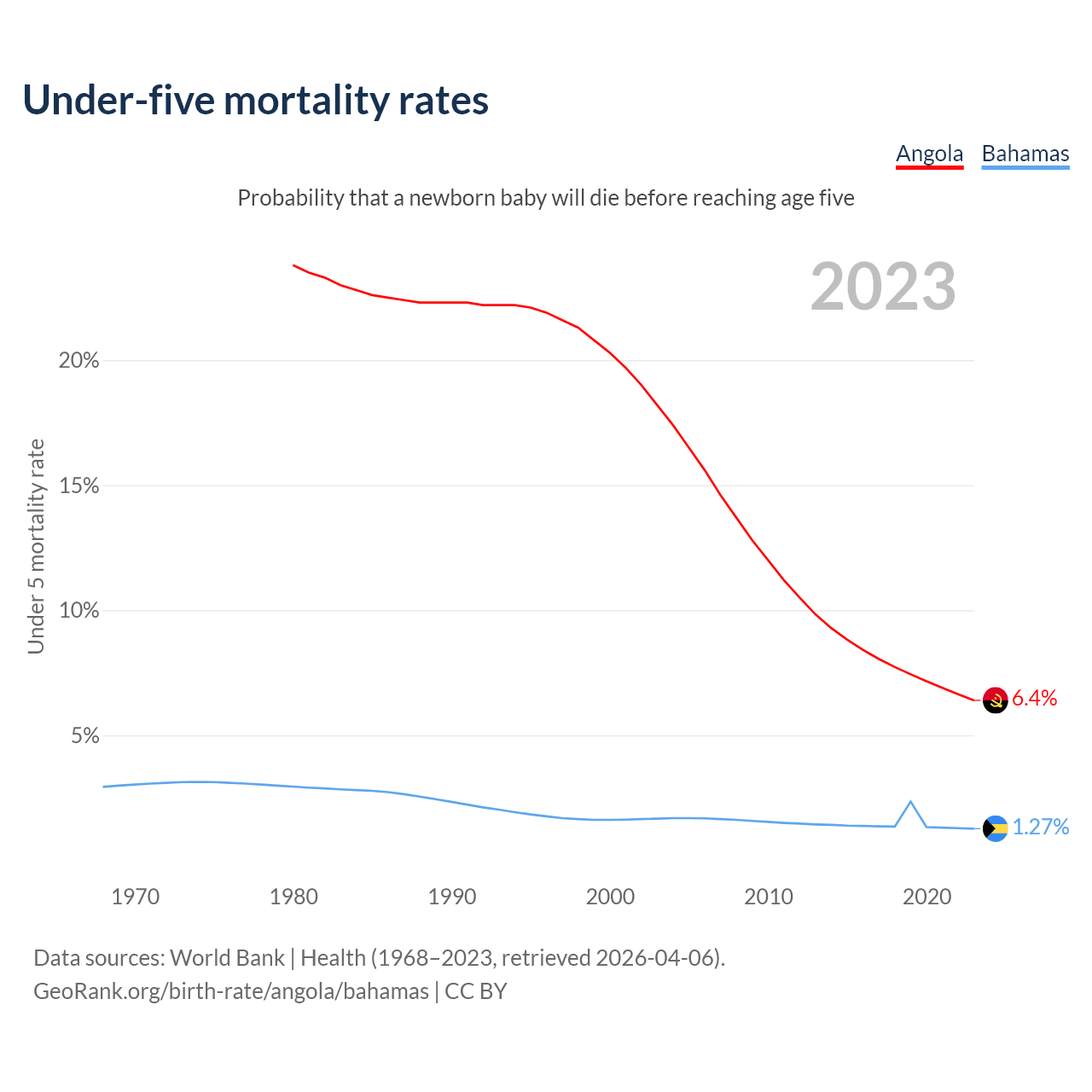 The chance that a newborn baby will die before reaching age five is 6.4% in Angola and 1.27% in the Bahamas. Above is a chart with historical data on under-five mortality rates.