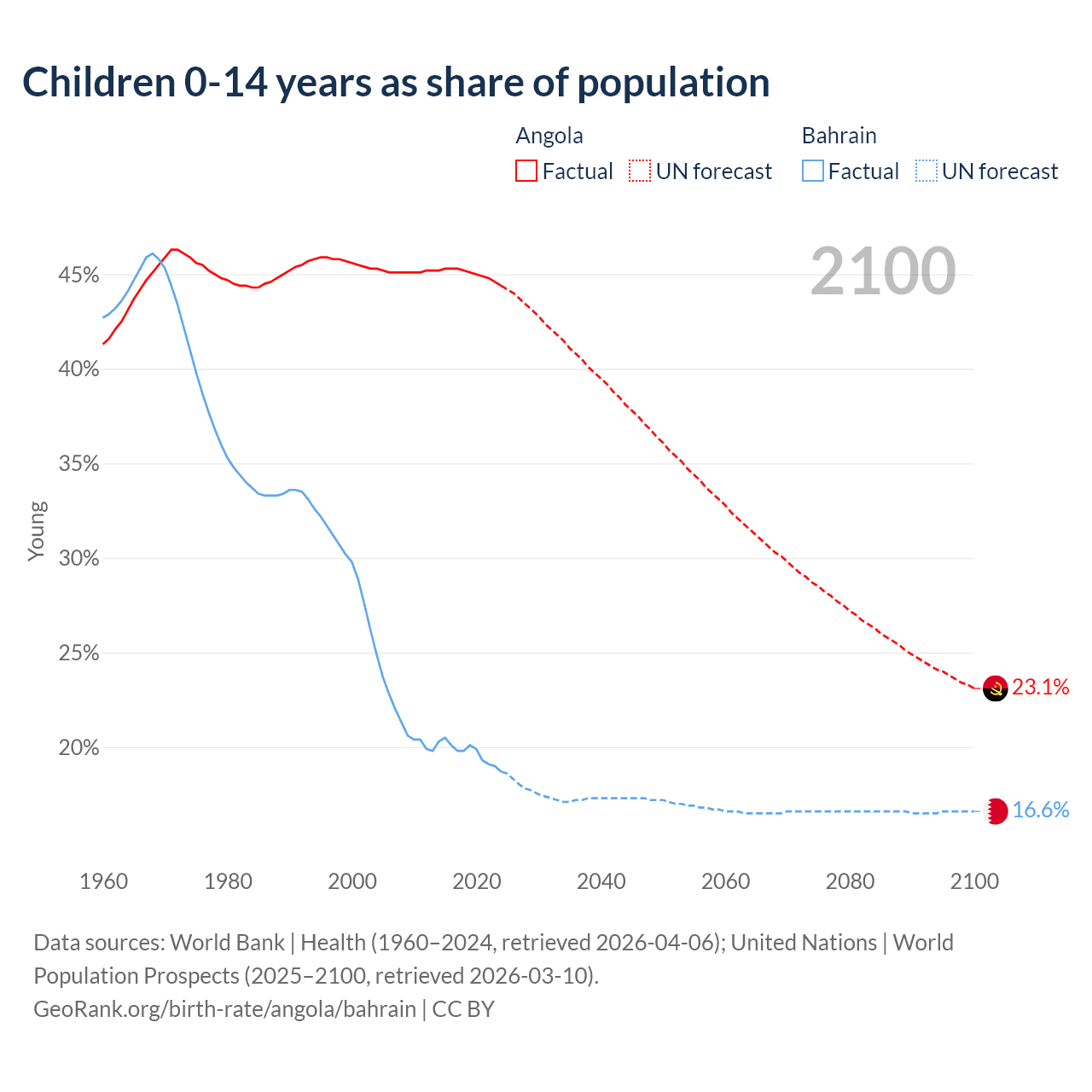 According to the latest available data on birth rates, the fertility rate in Angola was 5.12 children per woman in 2023, compared to 1.82 in Bahrain in 2023. The replacement level is considered to be 2.1 children per woman.