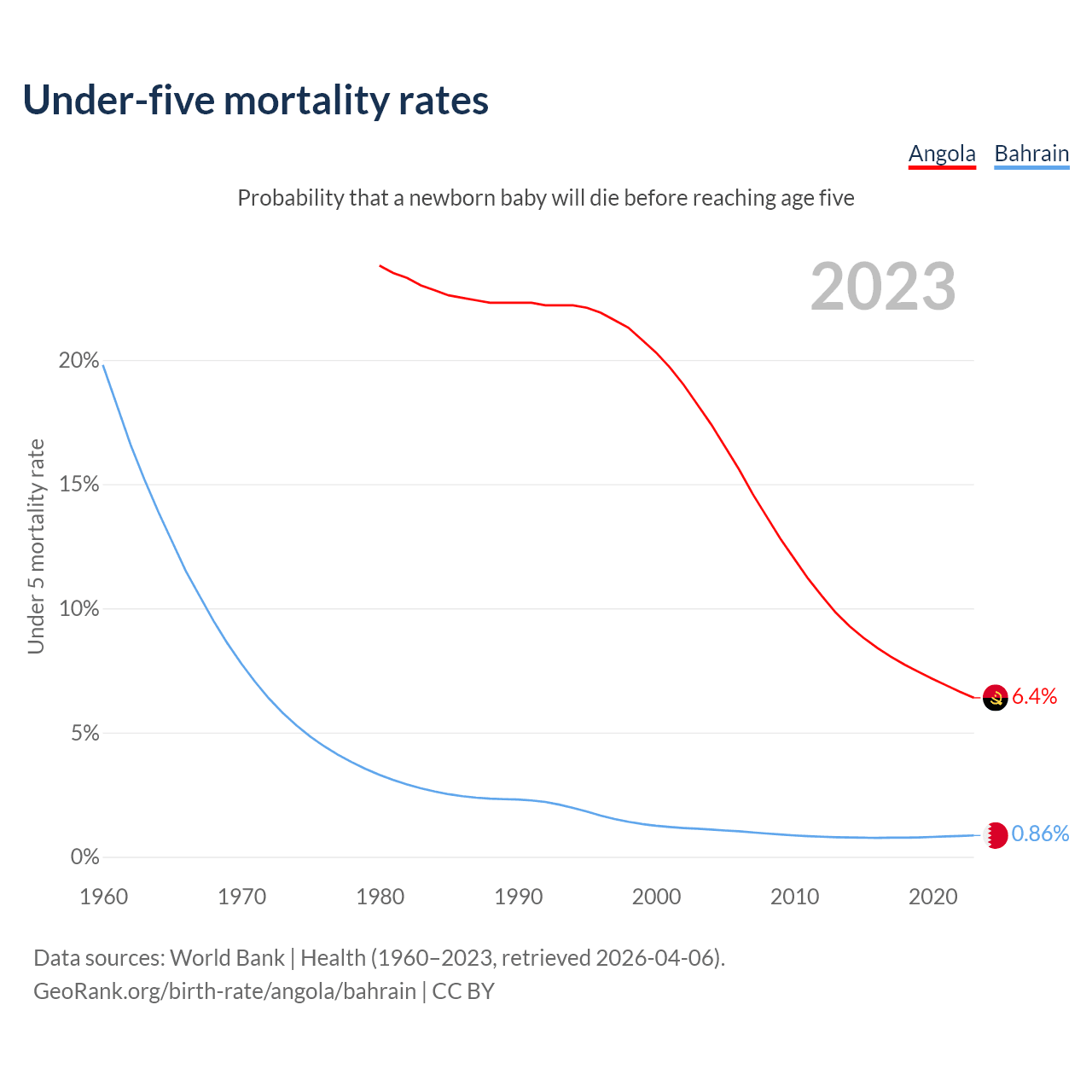 The chance that a newborn baby will die before reaching age five is 6.4% in Angola and 0.86% in Bahrain. Above is a chart with historical data on under-five mortality rates.