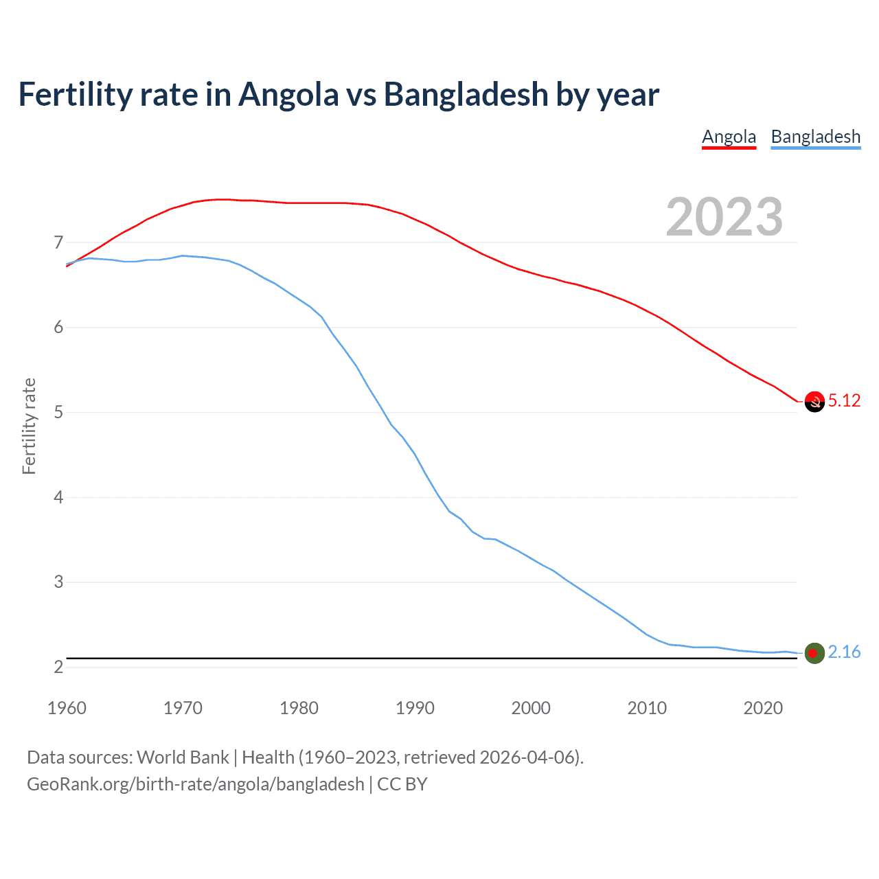 According to the latest available data on birth rates, the fertility rate in Angola was 5.12 children per woman in 2023, compared to 2.16 in Bangladesh in 2023. The replacement level is considered to be 2.1 children per woman.