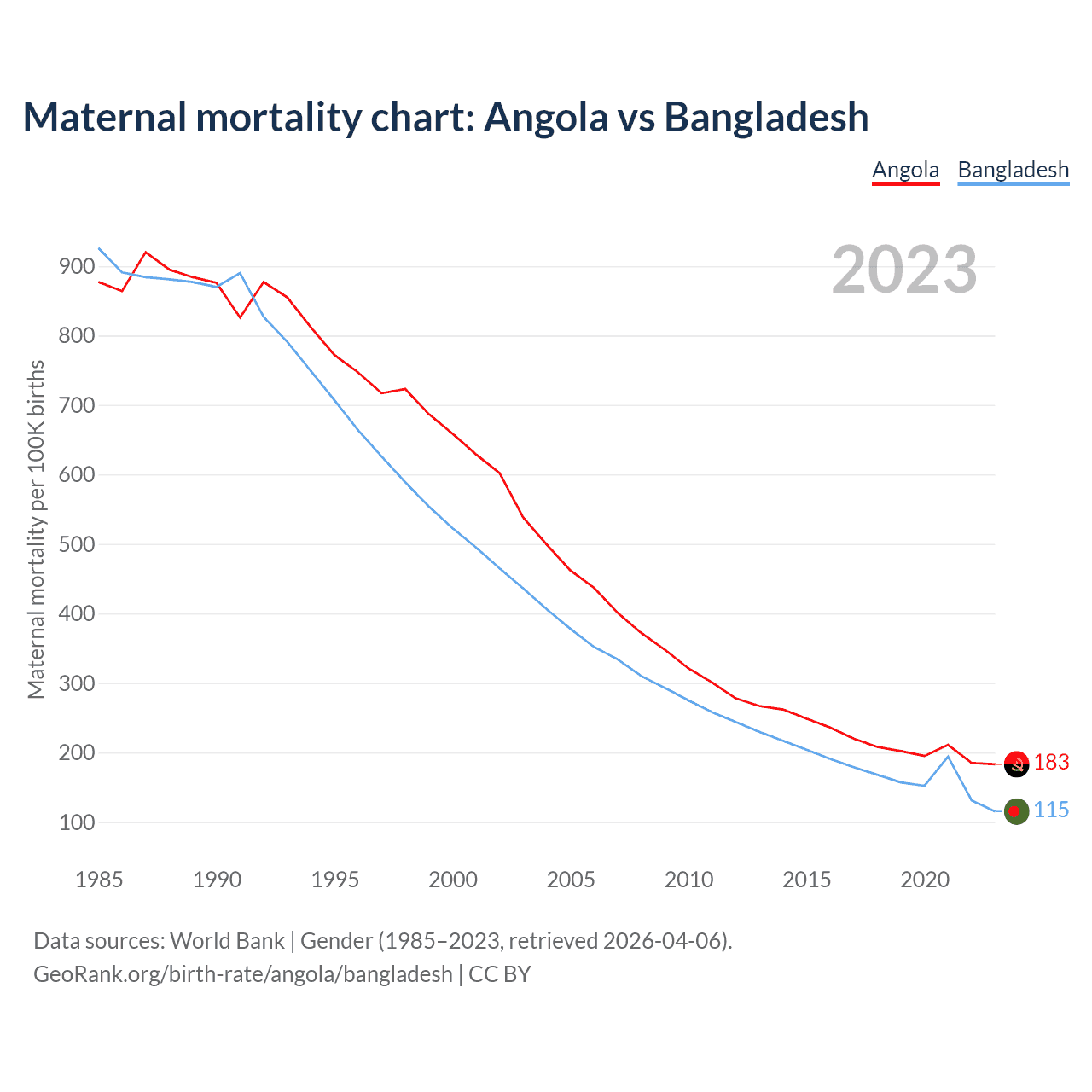 The maternal mortality rate, which is the probability of dying during childbirth or within 42 days of pregnancy termination, is 183 deaths per 100,000 live births in Angola, compared to 115 deaths in Bangladesh.