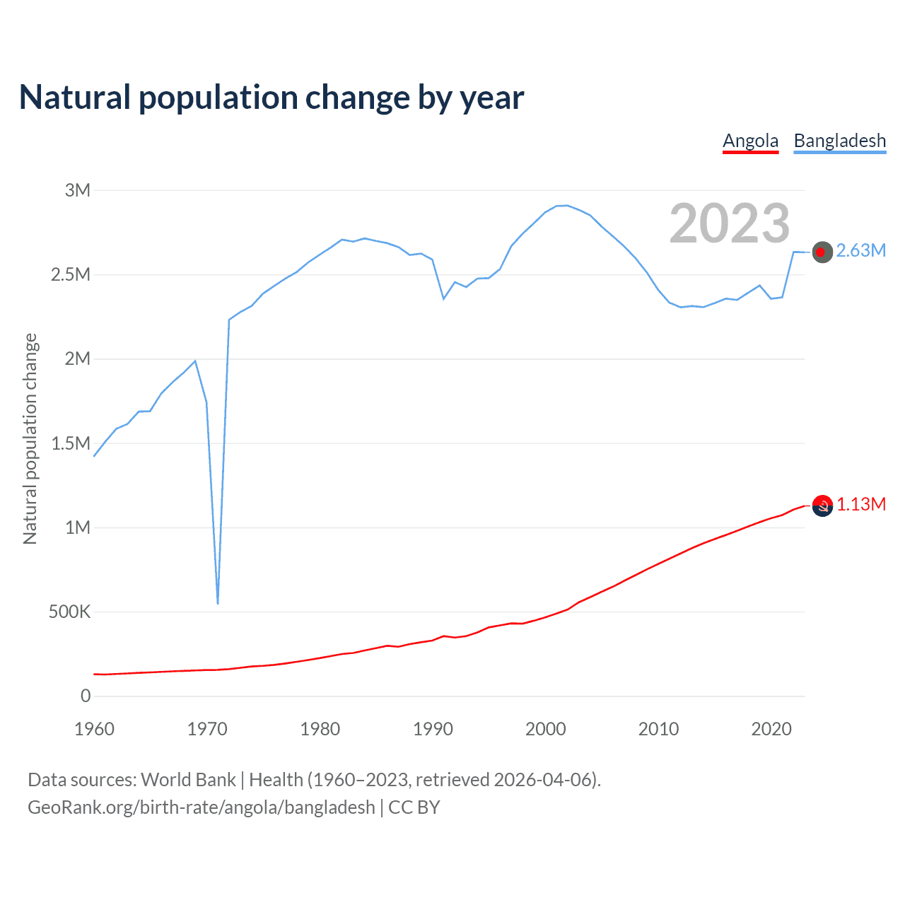 Data sources: World Bank | Health (1960–2023, retrieved 2026-04-06).
