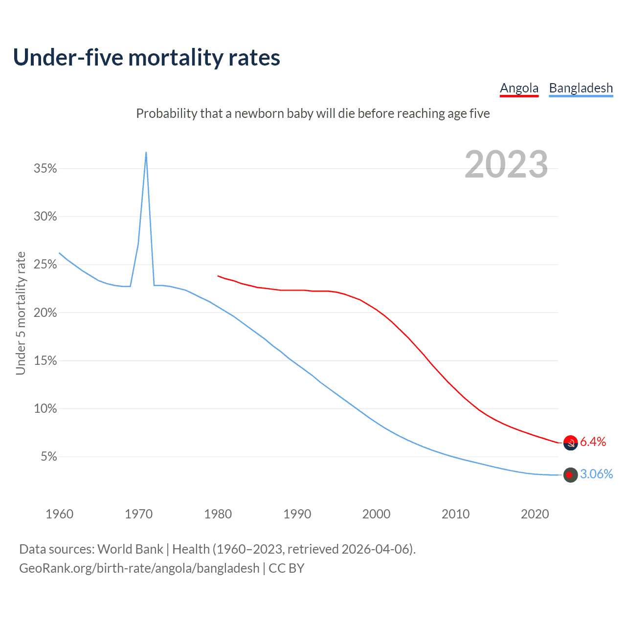 The chance that a newborn baby will die before reaching age five is 6.4% in Angola and 3.06% in Bangladesh. Above is a chart with historical data on under-five mortality rates.