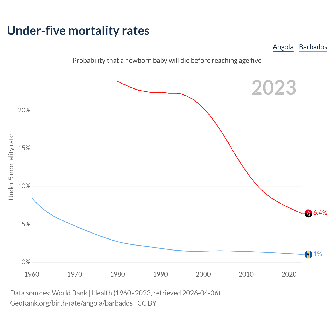 The chance that a newborn baby will die before reaching age five is 6.4% in Angola and 1% in Barbados. Above is a chart with historical data on under-five mortality rates.