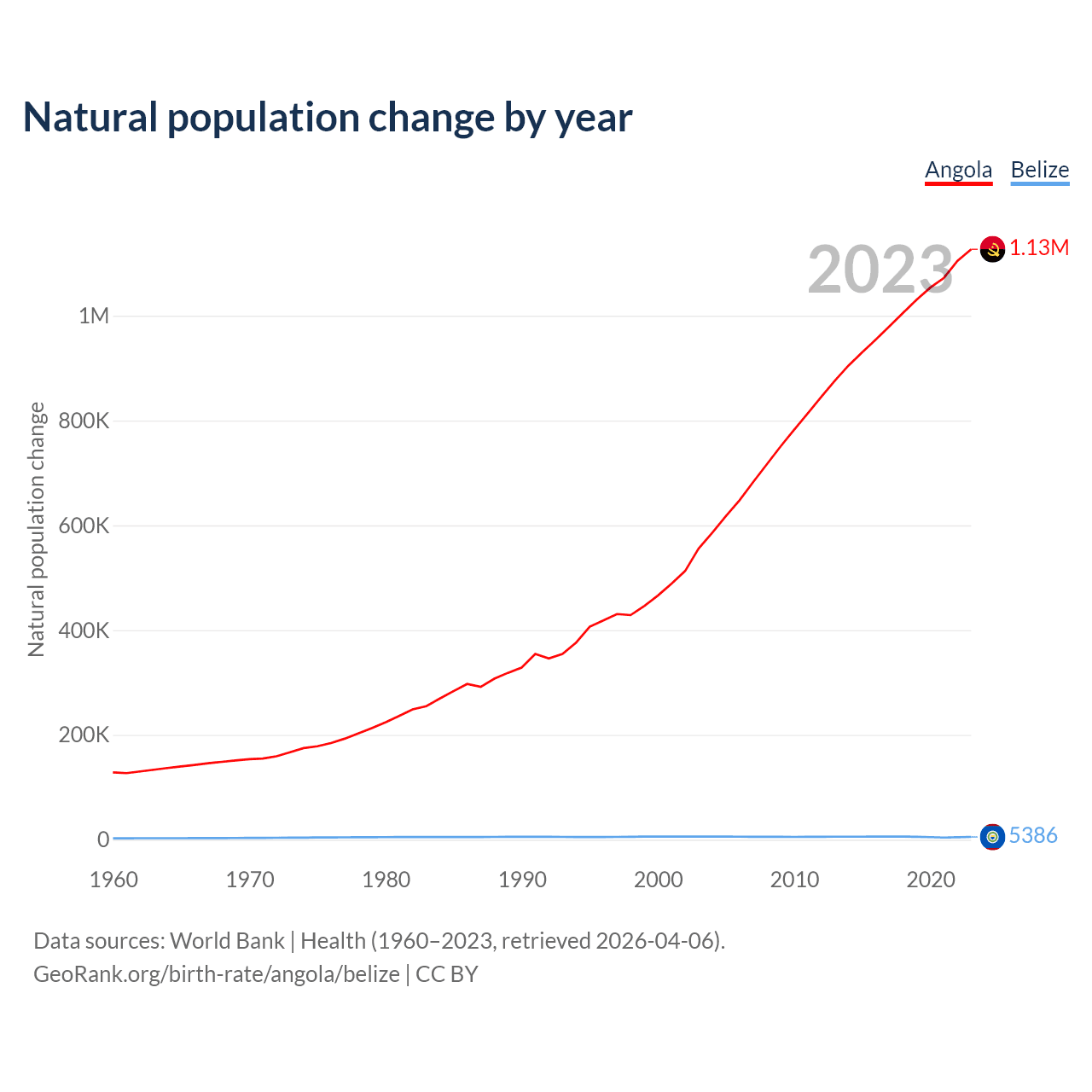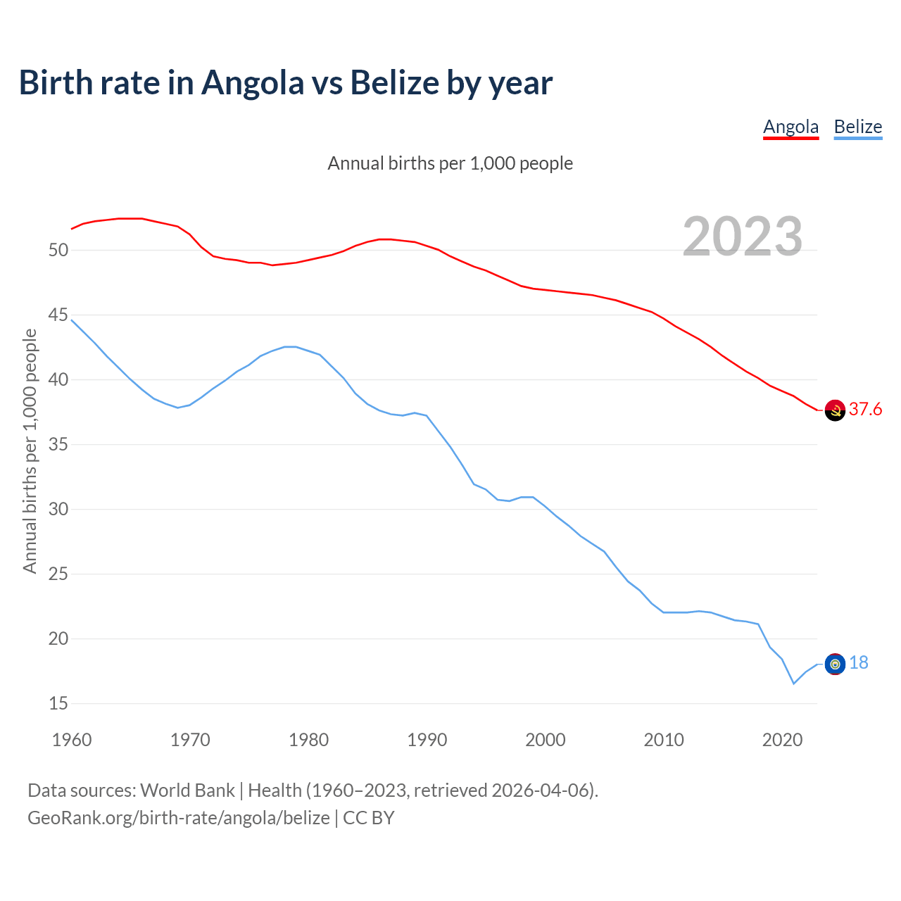 Angola has an annual birth rate of 37.6 births per 1,000 people, compared to 18 for Belize. The average number of children a woman is expected to have during her lifetime — the fertility rate, is 5.12 in Angola and 2.01 in Belize — 60.8% difference.