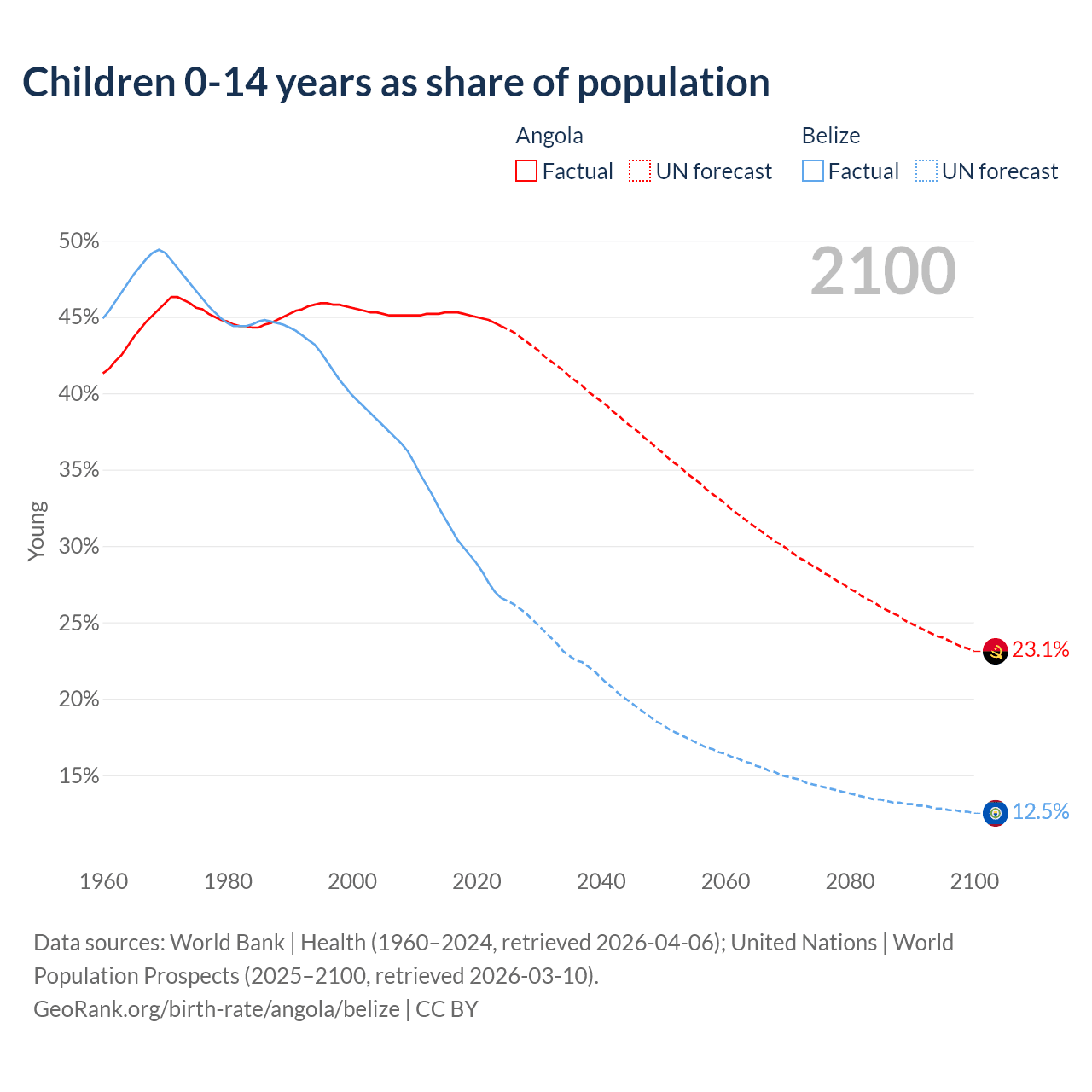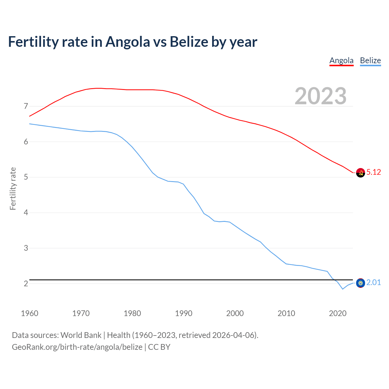 According to the latest available data on birth rates, the fertility rate in Angola was 5.12 children per woman in 2023, compared to 2.01 in Belize in 2023. The replacement level is considered to be 2.1 children per woman.