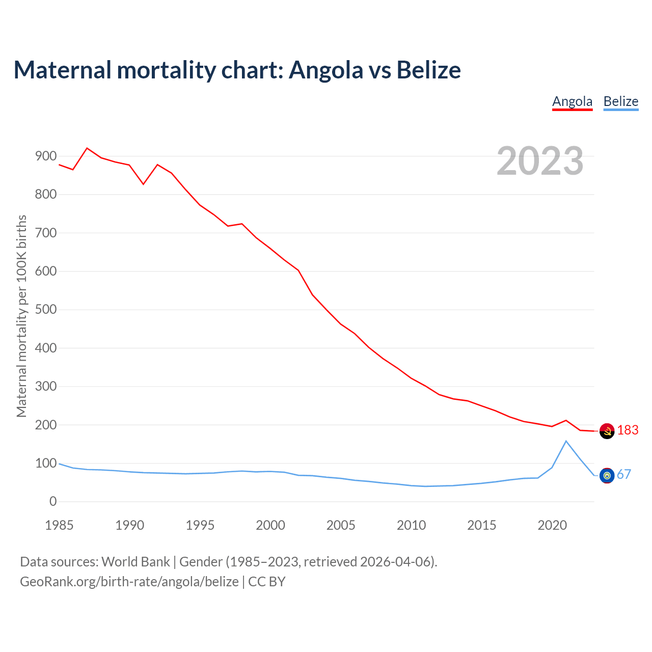 The maternal mortality rate, which is the probability of dying during childbirth or within 42 days of pregnancy termination, is 183 deaths per 100,000 live births in Angola, compared to 67 deaths in Belize.