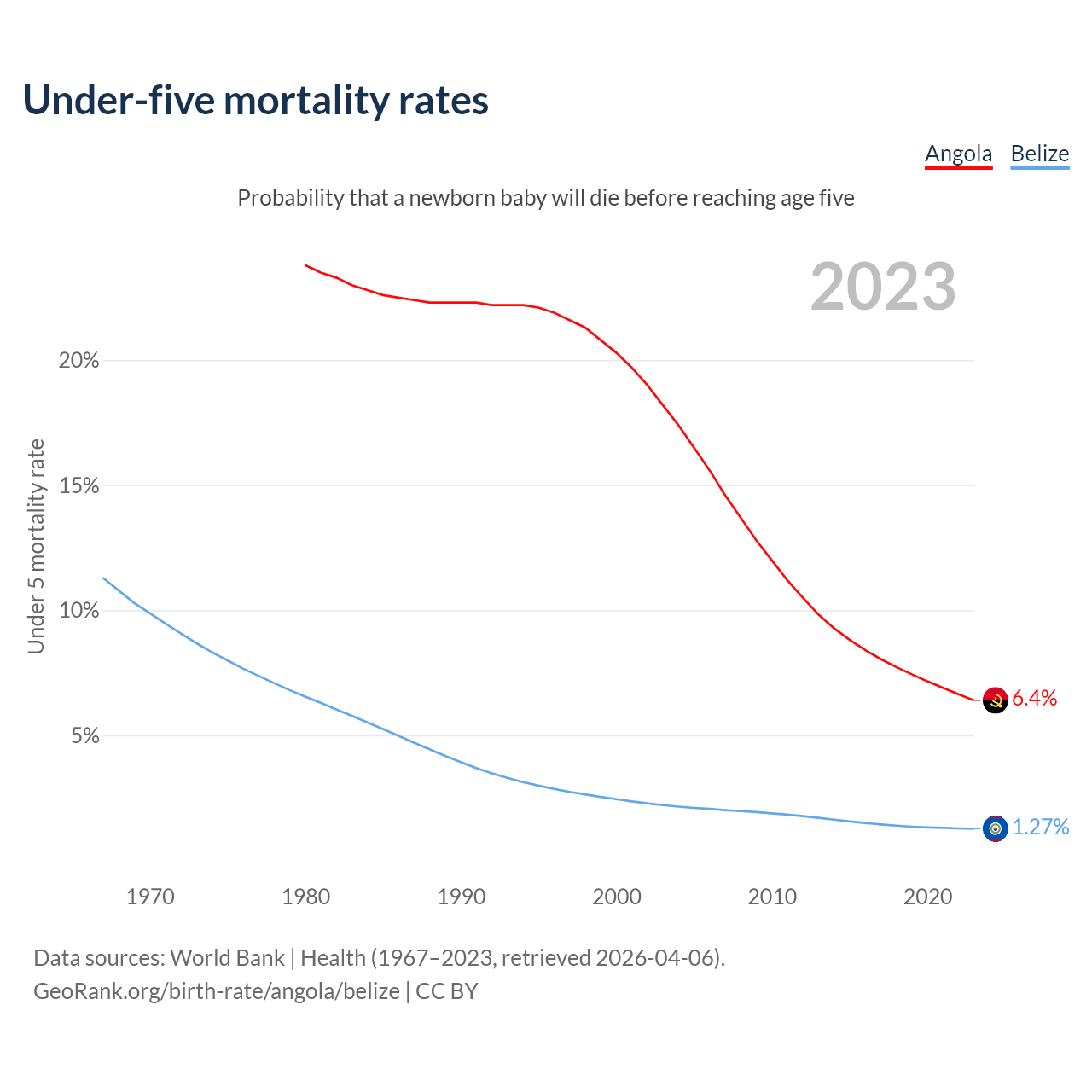 The chance that a newborn baby will die before reaching age five is 6.4% in Angola and 1.27% in Belize. Above is a chart with historical data on under-five mortality rates.
