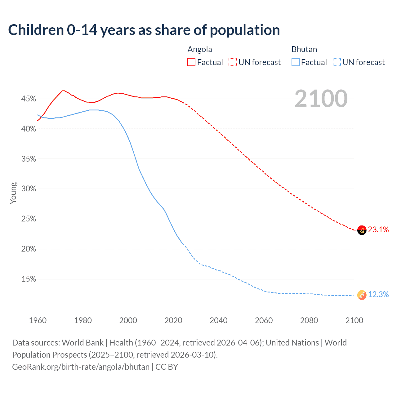 Angola has an annual birth rate of 37.6 births per 1,000 people, compared to 12.7 for Bhutan. The average number of children a woman is expected to have during her lifetime — the fertility rate, is 5.12 in Angola and 1.46 in Bhutan — 71.5% difference.
