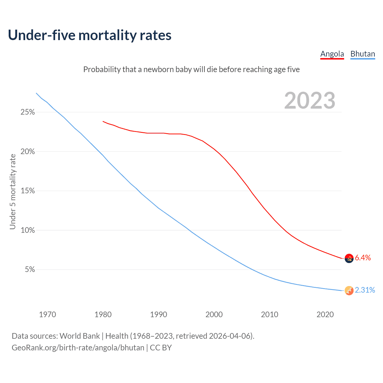 The chance that a newborn baby will die before reaching age five is 6.4% in Angola and 2.31% in Bhutan. Above is a chart with historical data on under-five mortality rates.
