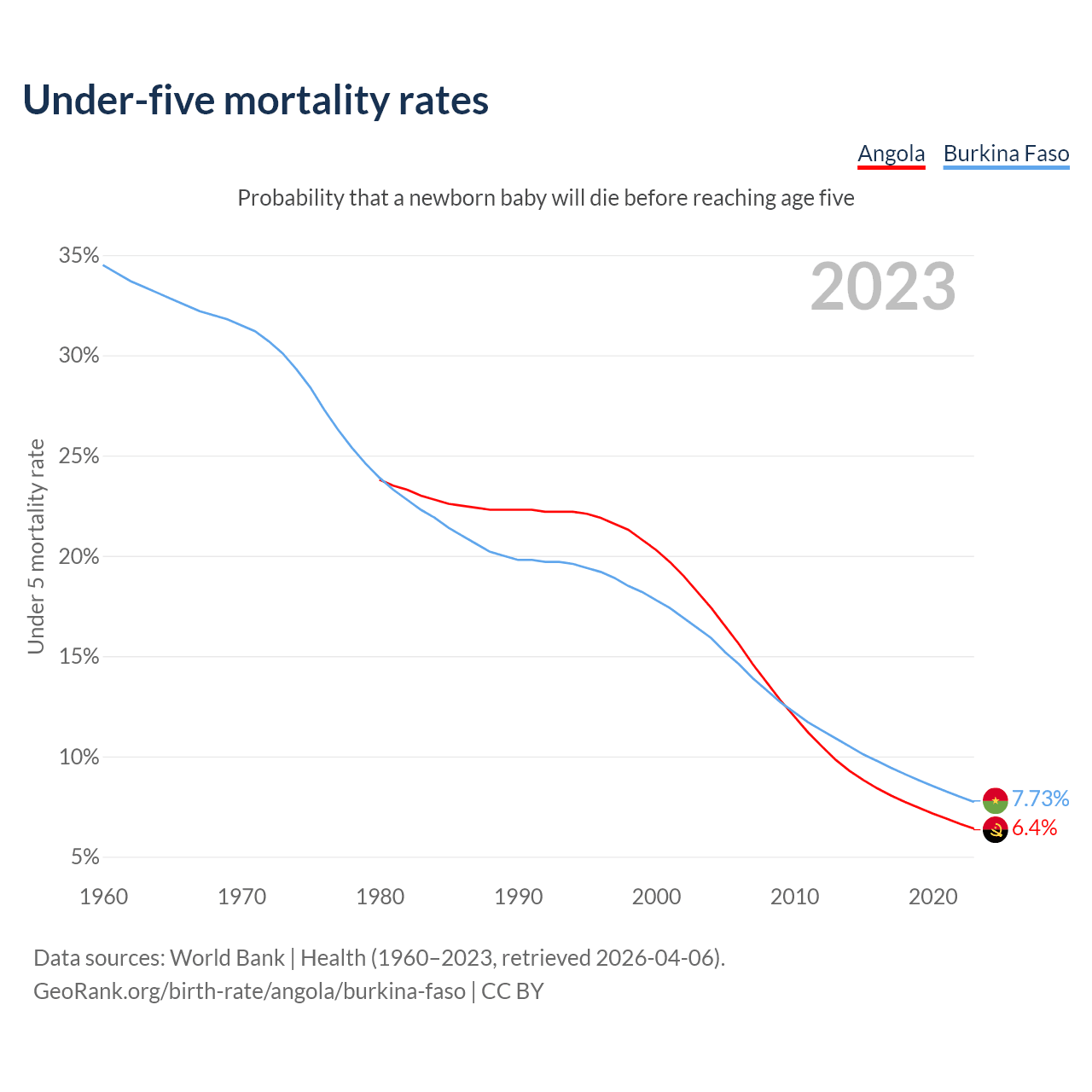 The chance that a newborn baby will die before reaching age five is 6.4% in Angola and 7.73% in Burkina Faso. Above is a chart with historical data on under-five mortality rates.