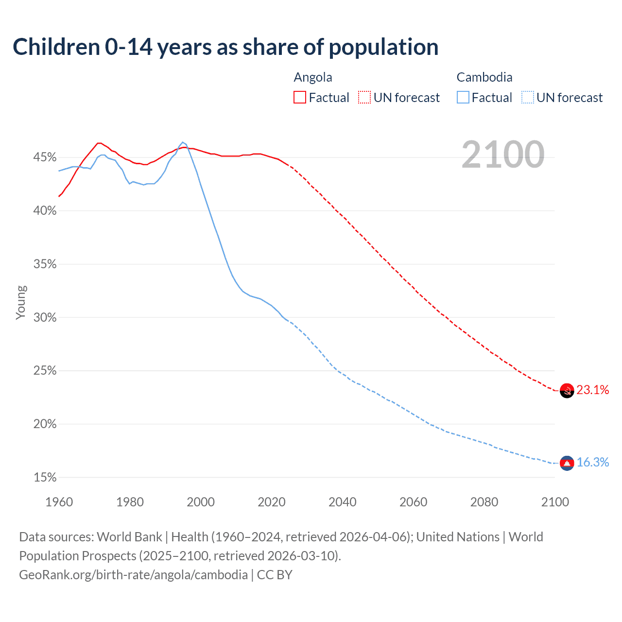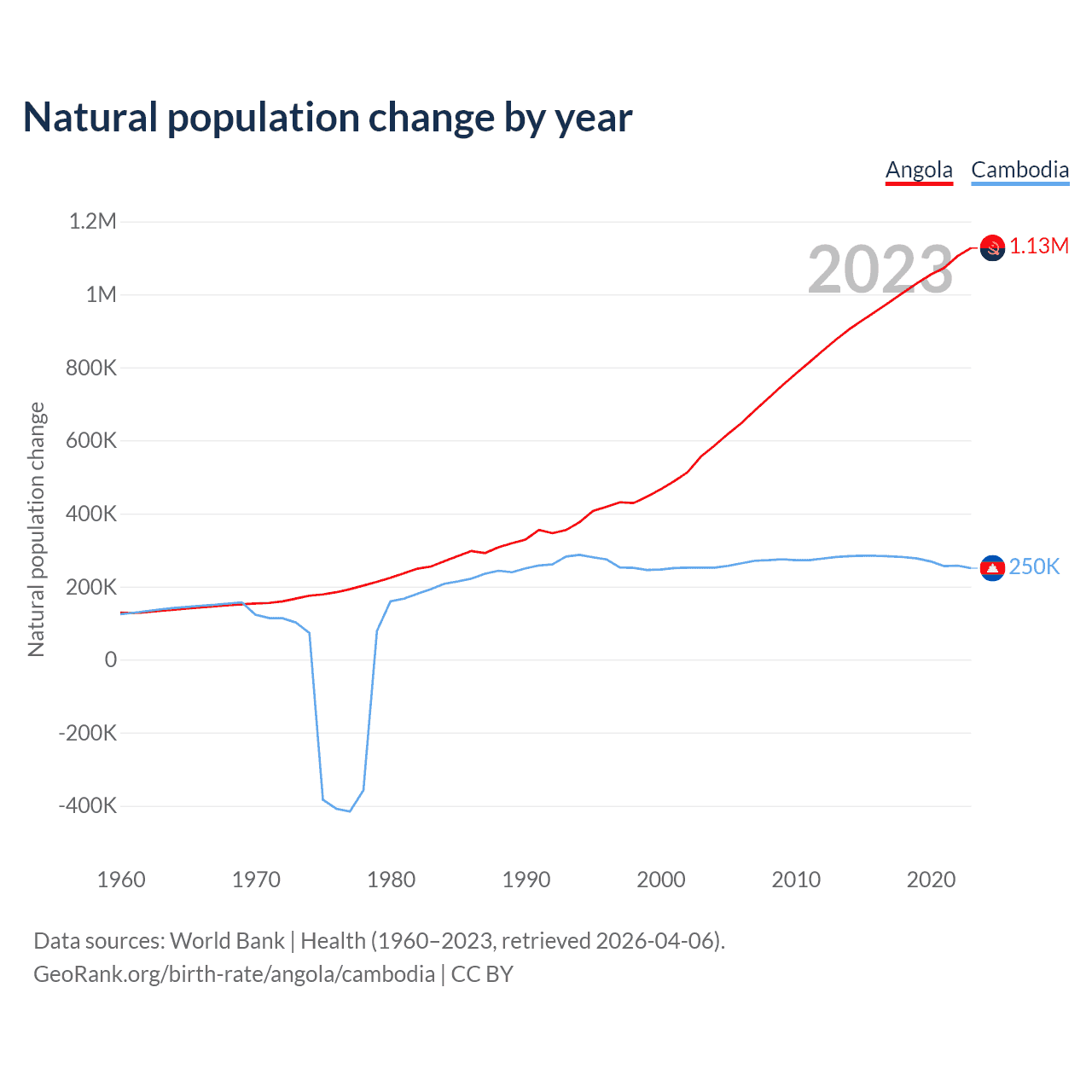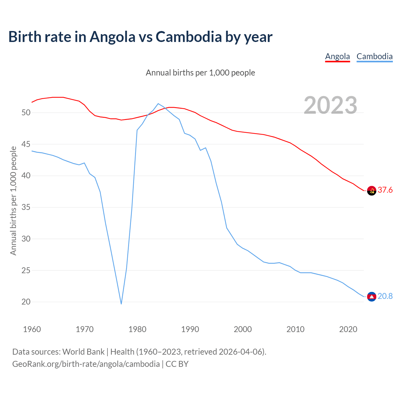Angola has an annual birth rate of 37.6 births per 1,000 people, compared to 20.8 for Cambodia. The average number of children a woman is expected to have during her lifetime — the fertility rate, is 5.12 in Angola and 2.58 in Cambodia — 49.7% difference.
