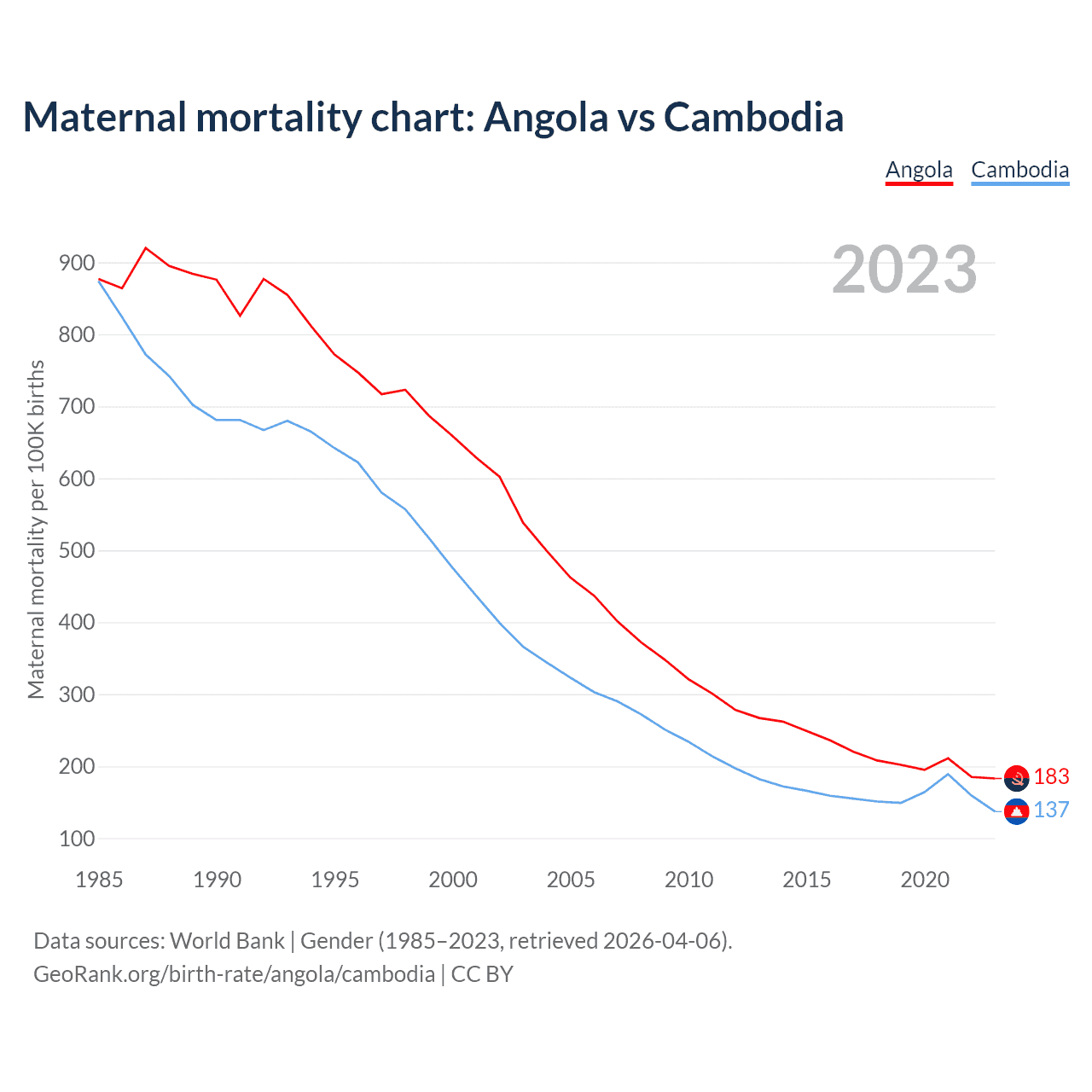 The maternal mortality rate, which is the probability of dying during childbirth or within 42 days of pregnancy termination, is 183 deaths per 100,000 live births in Angola, compared to 137 deaths in Cambodia.