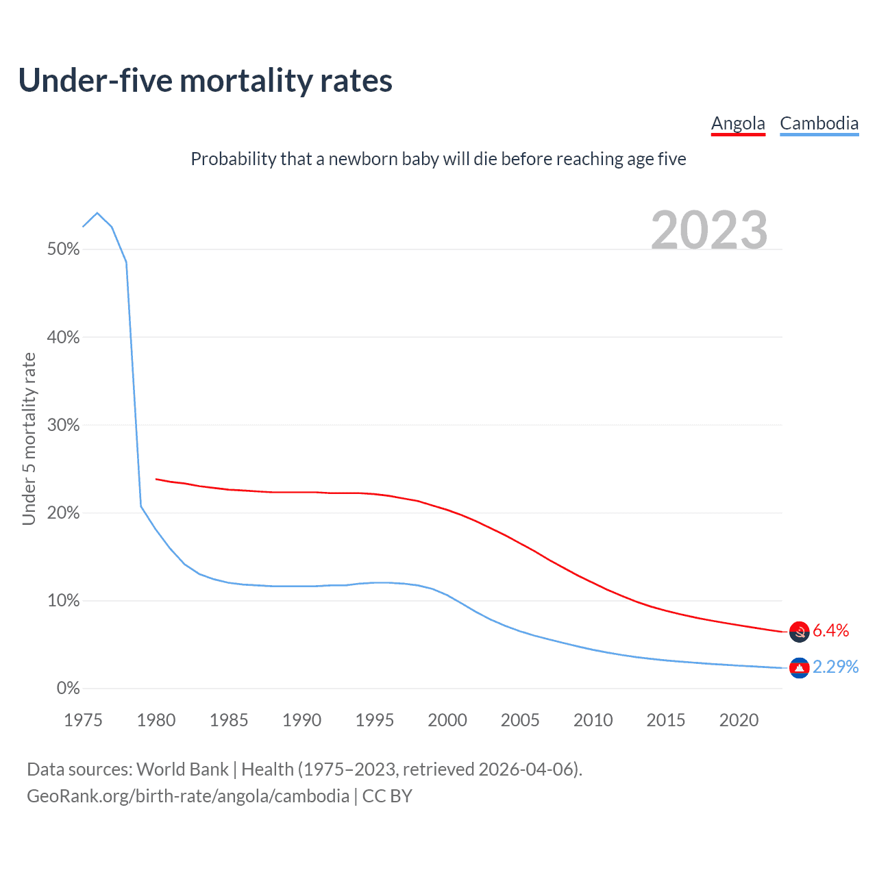 The chance that a newborn baby will die before reaching age five is 6.4% in Angola and 2.29% in Cambodia. Above is a chart with historical data on under-five mortality rates.