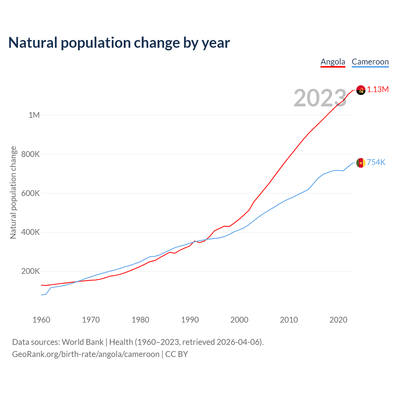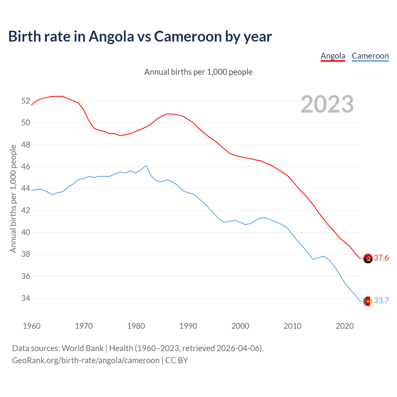 Angola has an annual birth rate of 37.6 births per 1,000 people, compared to 33.7 for Cameroon. The average number of children a woman is expected to have during her lifetime — the fertility rate, is 5.12 in Angola and 4.32 in Cameroon — 15.7% difference.