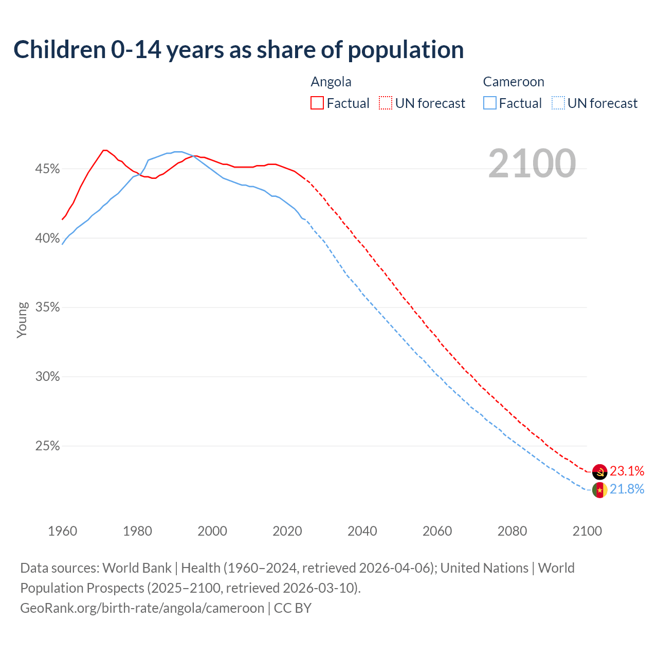 According to the latest available data on birth rates, the fertility rate in Angola was 5.12 children per woman in 2023, compared to 4.32 in Cameroon in 2023. The replacement level is considered to be 2.1 children per woman.