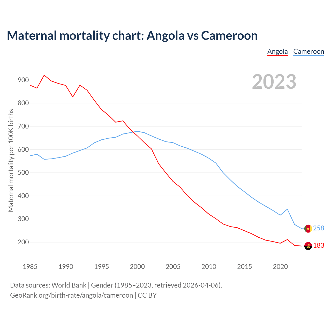 The maternal mortality rate, which is the probability of dying during childbirth or within 42 days of pregnancy termination, is 183 deaths per 100,000 live births in Angola, compared to 258 deaths in Cameroon.